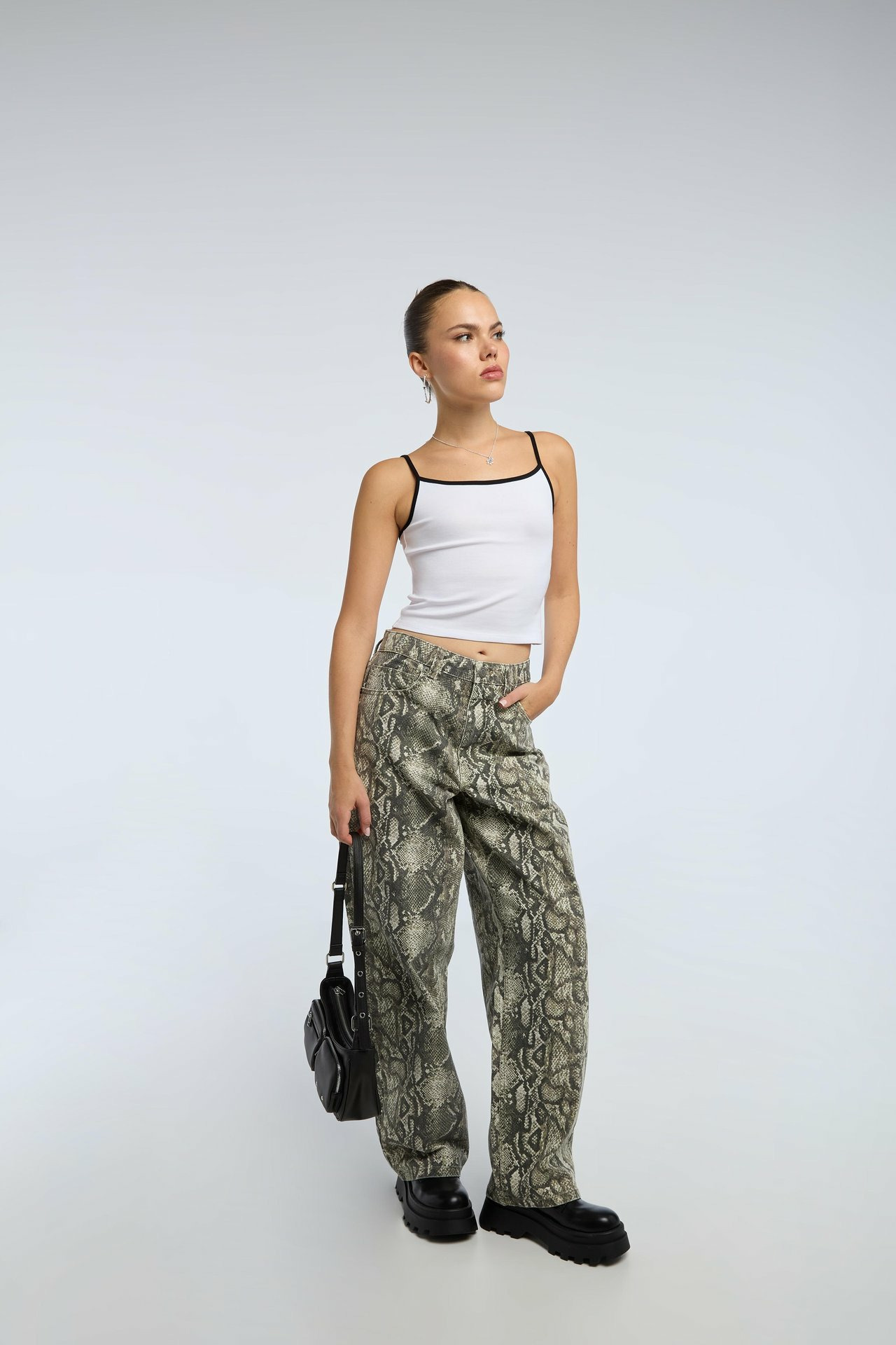 Réponse : Sa coupe skinny et son effet push up conviennent particulièrement aux silhouettes fines à moyennes, valorisant les courbes naturelles.