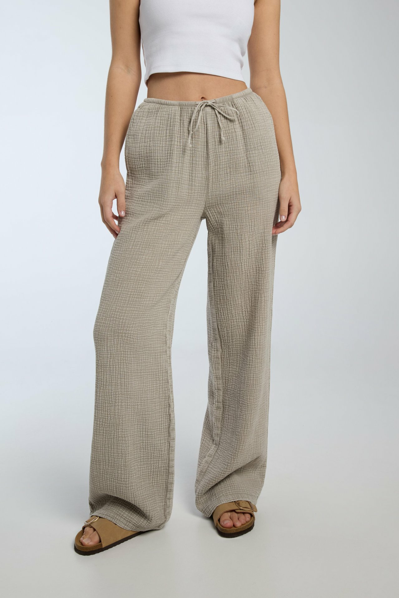 Fabriqué en mousseline de qualité, ce pantalon présente une taille élastique pour un ajustement parfait et une fermeture discrète. Sa coupe droite légèrement évasée et sa matière transparente nécessitent un sous-vêtement adapté pour un rendu impeccable.