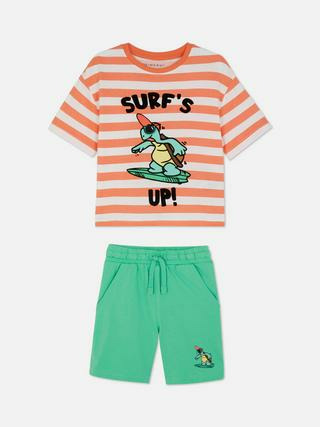 L’ensemble comprend un t-shirt à rayures avec motif tortue et un short à cordon de serrage. Disponible en tailles adaptées aux garçons de 1,5 à 8 ans. Marque : Primark.