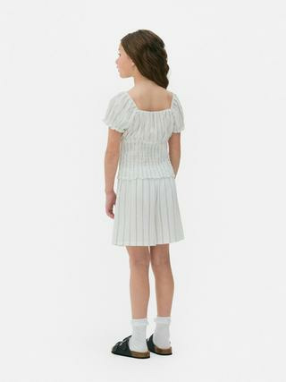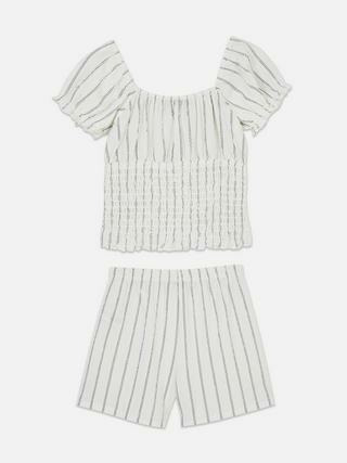 Ensemble composé d’un chemisier froncé à manches courtes et d’un short à taille élastiquée. Disponible en tailles adaptées aux filles de 7 à 15 ans. Marque : Primark. Matière et instructions d’entretien non spécifiées.