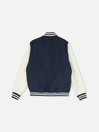 Blouson bomber style universitaire à boutons-pression, doté de poches latérales. Finitions côtelées au col, poignets et bas de veste. Matière légère adaptée aux saisons intermédiaires. Disponible en plusieurs tailles pour garçons.
