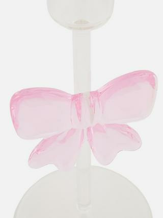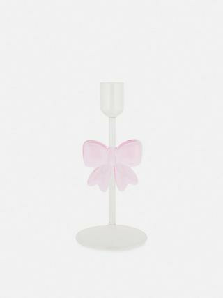 Dimensions précises non communiquées. Bougeoir en verre transparent avec un nœud décoratif intégré. Marque : Primark. Catégorie : Solutions de rangement et accessoires.