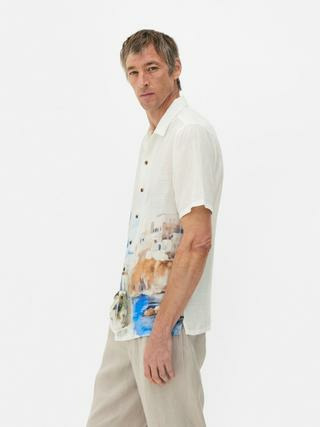 Chemise à manches courtes avec fermeture boutonnée sur le devant. Motif effet aquarelle imprimé. Marque : Primark. Disponible en plusieurs tailles.