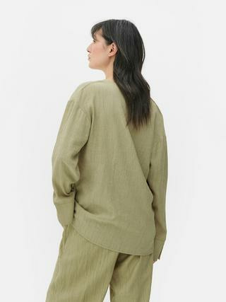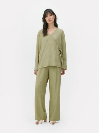 Fabriqué par Primark, ce chemisier est disponible dans la catégorie Chemises et blouses. Il présente une coupe décontractée, un tissu texturé froissé, un côté à nouer et des manches longues, garantissant une pièce polyvalente et confortable.