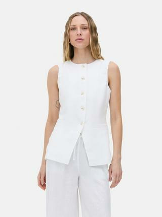 Confectionné dans un lin mélangé, ce gilet allie confort et style naturel. Son col rond et sa fermeture boutonnée apportent une touche contemporaine, tandis que les fausses poches renforcent son design épuré. Idéal pour structurer une tenue sans alourdir votre look, il se porte aussi bien en journée qu’en soirée.