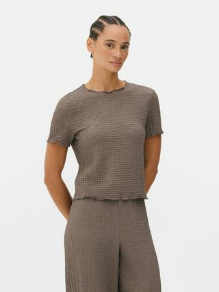 Ce top à manches courtes se distingue par son ourlet à volants et ses fronces qui créent un jeu de textures subtil et raffiné. Léger et ajusté, il épouse parfaitement la silhouette pour un look à la fois confortable et sophistiqué, idéal du bureau au weekend. Son design polyvalent s’associe facilement à un jean, une jupe ou un pantalon habillé.