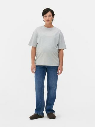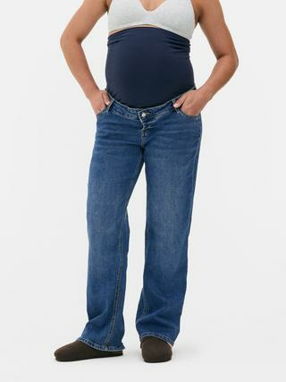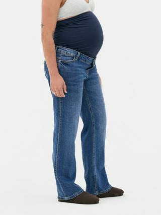 Jean droit de maternité Primark, fermeture boutonnée, passants de ceinture, poches avant et arrière, denim souple, coupe droite.