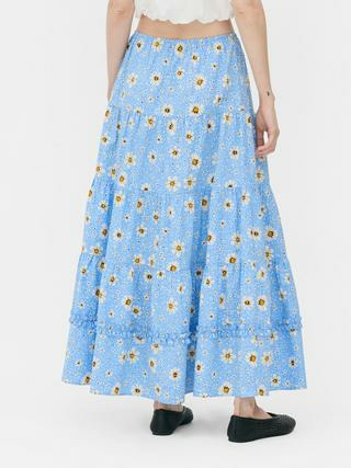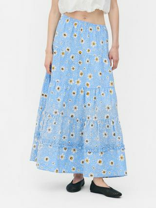 Fabriquée dans un tissu léger bleu clair, cette jupe longue présente plusieurs couches superposées pour un effet de volume maîtrisé. Son imprimé marguerites apporte une touche fraîche et naturelle. Disponible chez Primark, elle combine style et confort au quotidien.