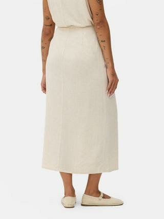 Réponse : La jupe est confectionnée dans un tissu texturé qui apporte structure et élégance tout en restant confortable.
