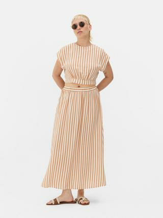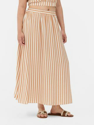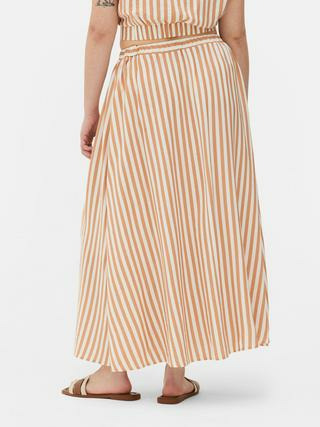 Fabriquée par Primark, cette jupe mi-longue présente une coupe fluide avec liens à nouer à la taille et un motif rayé vertical. Sa longueur mi-longue assure une tenue élégante et confortable au quotidien.