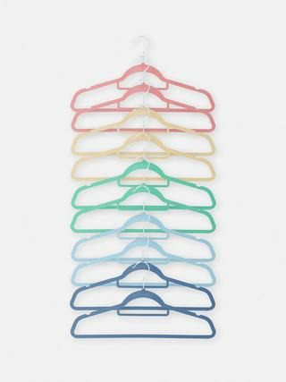 Lot de 10 cintres en plastique coloré, adaptés aux vêtements enfantins. Dimensions standards pour penderies enfant. Marque Primark, reconnue pour ses accessoires fonctionnels et accessibles.