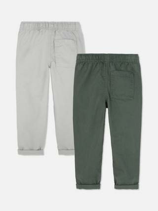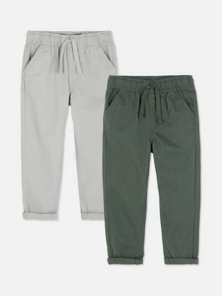 Lot de 2 pantalons en sergé pour garçon, marque Primark. Tissu robuste et agréable au toucher, coupe droite ajustée, taille élastiquée pour un maintien confortable. Disponible en plusieurs tailles.