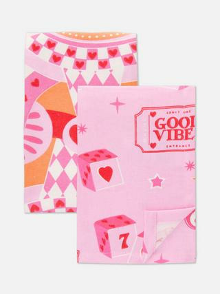 Lot de 2 torchons aux motifs colorés, marque Primark. Dimensions standards adaptées à un usage quotidien. Matière non spécifiée, entretien facile en machine.