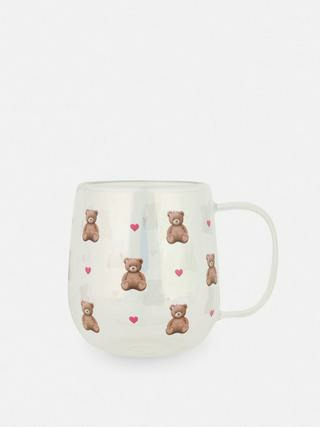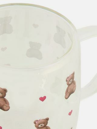 Mug en verre transparent avec motif ours et cœur imprimé. Capacité standard adaptée à toutes les boissons chaudes. Compatible lave-vaisselle pour un entretien simplifié. Marque Primark, référence var513dc96a3fc921da84631d61e321002b.
