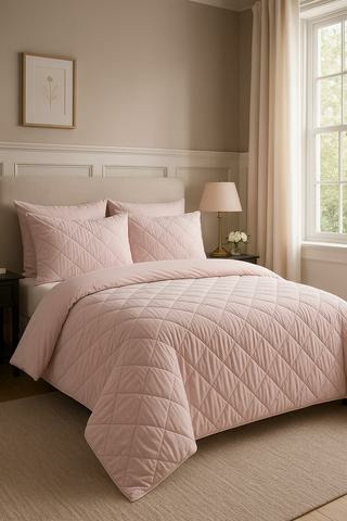 Dimensions king size adaptées aux lits larges, tissu matelassé en losanges pour un effet texturé, composition en coton et polyester pour une durabilité et un entretien simplifié. Lavable en machine.
