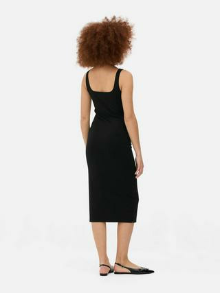 Fabriquée en jersey, cette robe débardeur présente une coupe ajustée avec une encolure carrée classique. Elle est proposée par la marque Primark, reconnue pour ses pièces mode accessibles et tendance.