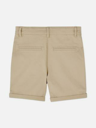 Short chino pour enfant Primark avec braguette à boutons, passants de ceinture, poches latérales et ourlets retroussés. Disponible en plusieurs tailles adaptées aux garçons.