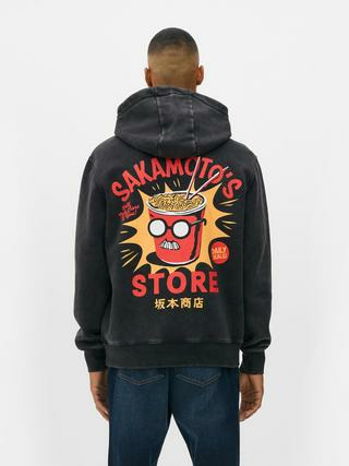 Sweat à capuche délavé avec motif Sakamoto Days imprimé sur le devant. Poche kangourou centrale. Marque : Primark. Matière et instructions d’entretien non spécifiées.