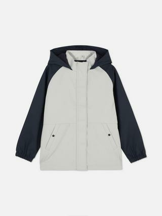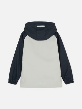Veste de pluie à capuche avec fermeture dissimulée à l’avant, poches fendues, poignets élastiqués. Disponible dans un design color block dynamique, adaptée aux vêtements garçon.