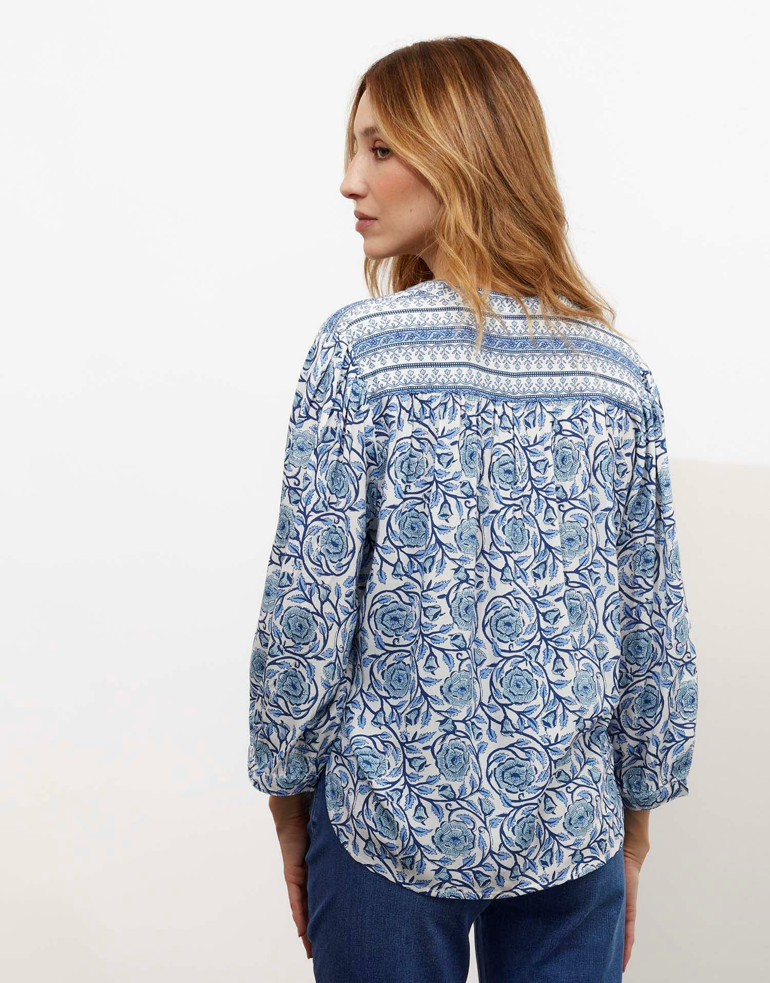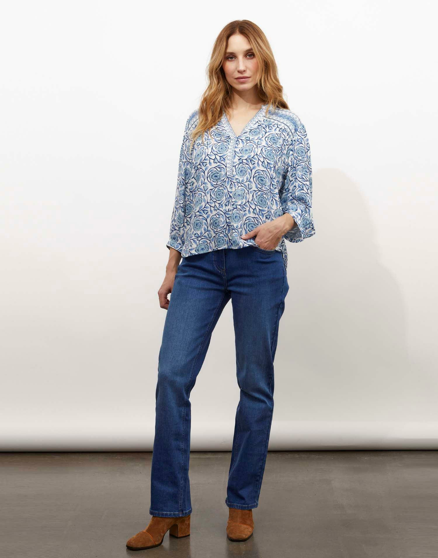 La mannequin mesure 1m75 et porte une taille 38. Blouse à manches 3/4, coupe fluide, encolure ouverte, imprimé floral bleu, tissu léger et agréable au toucher.