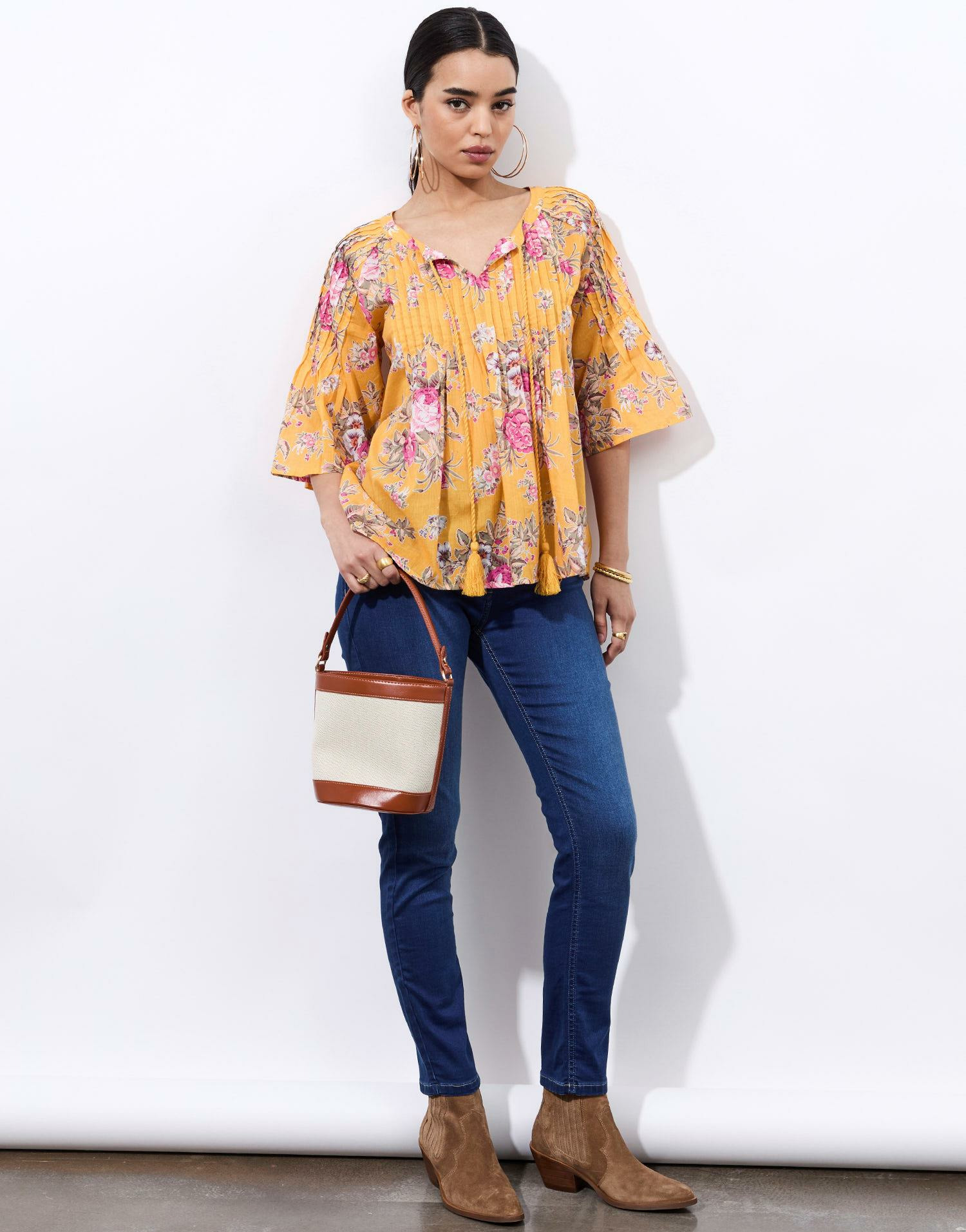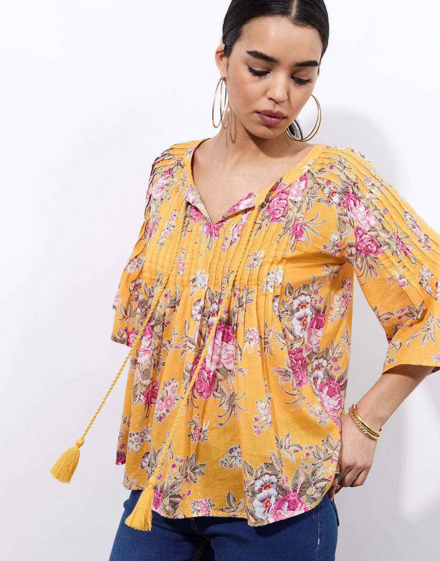 Illuminez votre garde-robe avec cette blouse manches 3/4 imprimé à fleurs jaune, une pièce signée RIU Paris qui allie légèreté et élégance. Son design bohème et féminin s’adapte à toutes vos envies de style.
