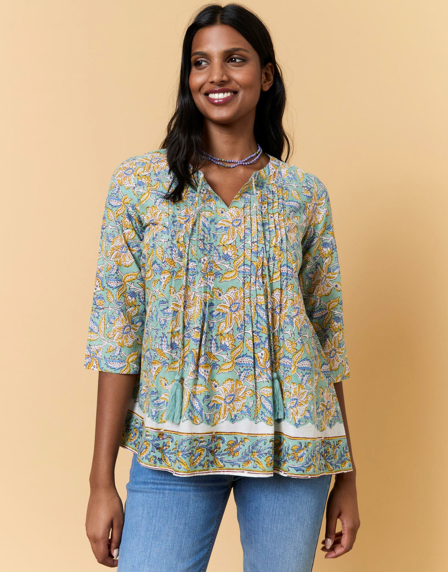 Confectionnée en coton, cette blouse offre une sensation de douceur et de légèreté idéale pour les journées ensoleillées. Les manches trois-quarts fluides soulignent une silhouette féminine tout en assurant un confort optimal. Son imprimé vert pâle, à la fois discret et raffiné, se marie facilement avec vos bas préférés pour un look naturel et sophistiqué.