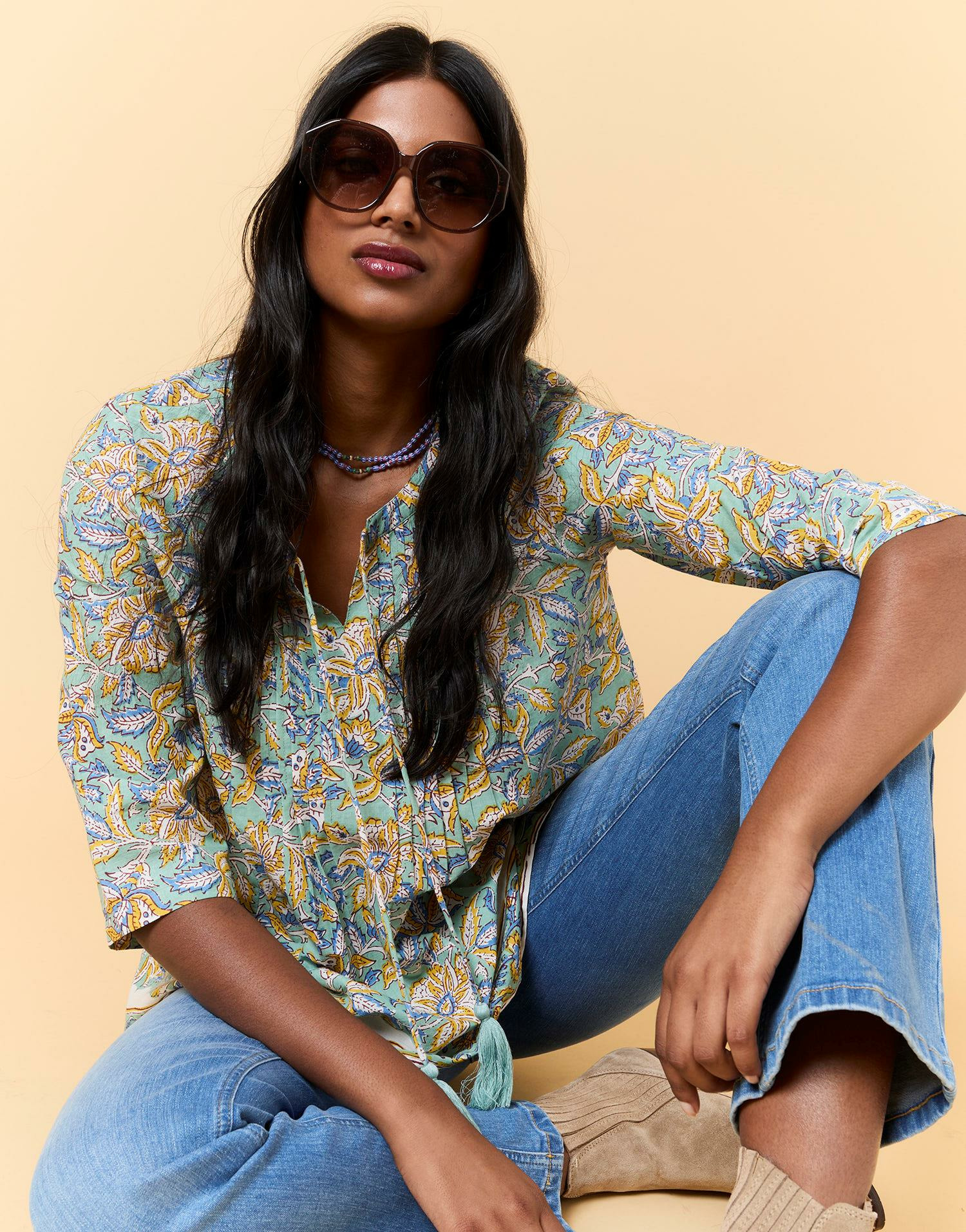Légère et délicate, cette blouse manches 3/4 imprimé à fleurs vert pâle incarne l’élégance estivale avec une touche bohème. Son imprimé floral poétique et son col en V agrémenté de liens à pompons apportent une fraîcheur subtile à votre garde-robe.