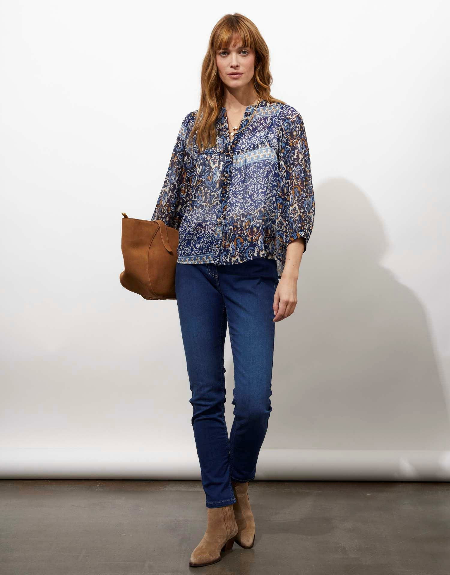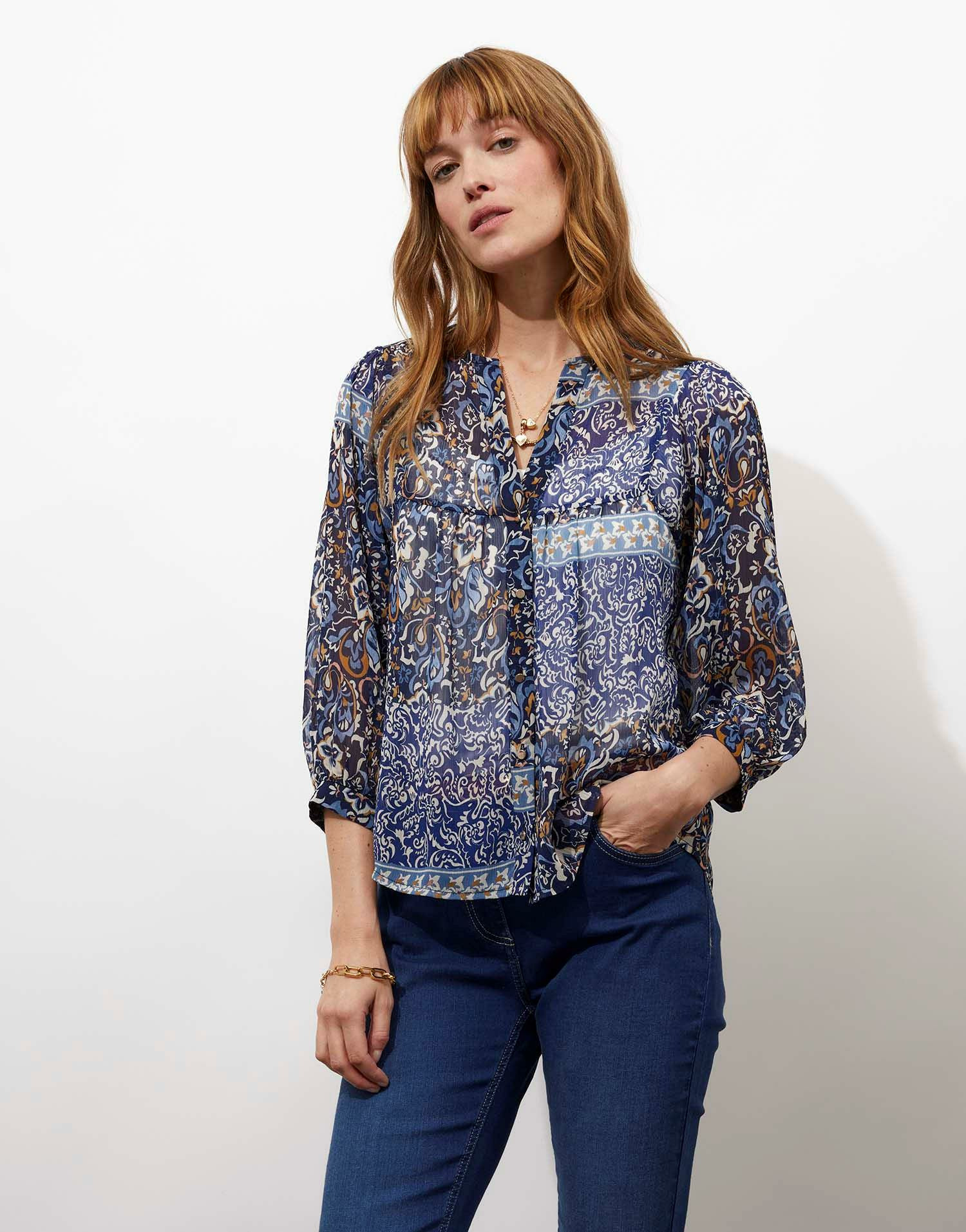 La mannequin mesure 1m75 et porte une taille 38. Blouse imprimée à manches 3/4, décolleté en V, coupe fluide, matière légère et agréable à porter.