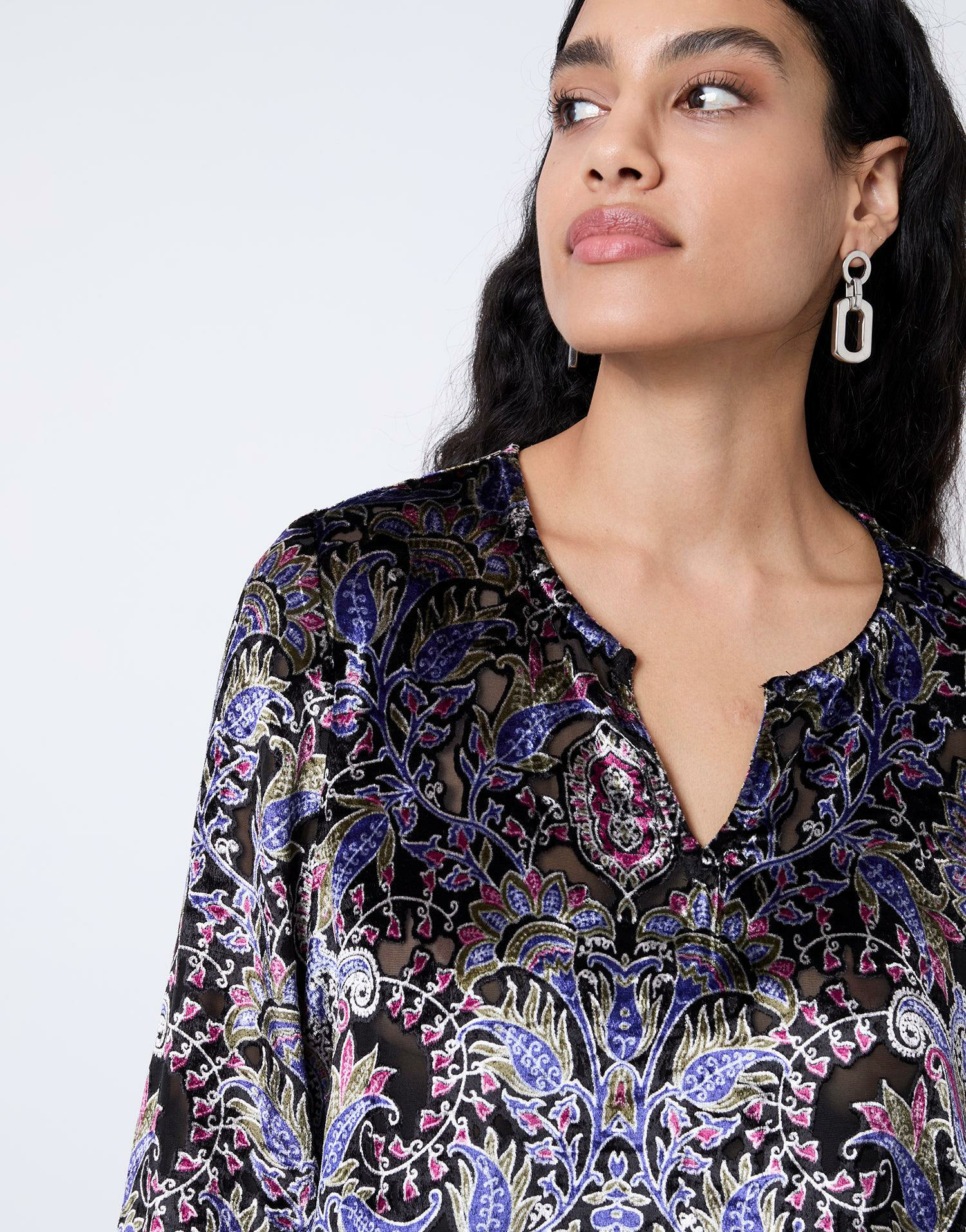 Quelle est la matière de la blouse ? La blouse est en velours imprimé, offrant douceur et texture élégante.