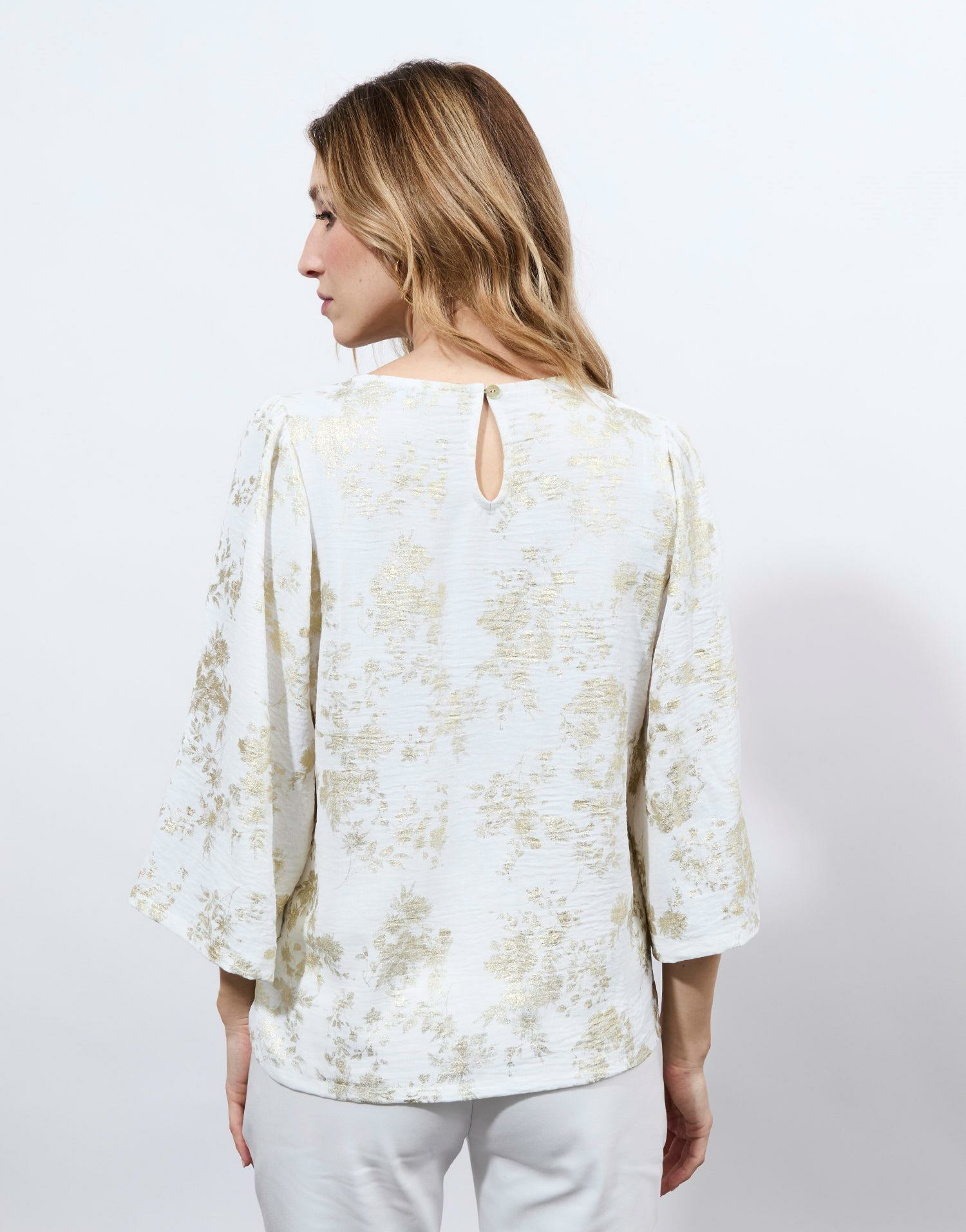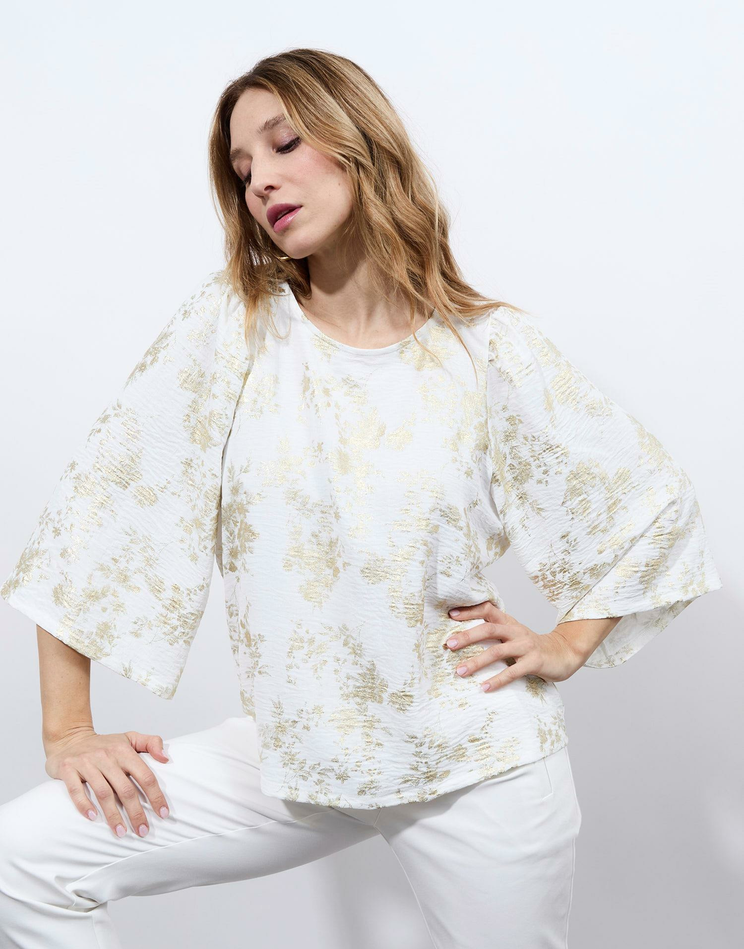 Blouse ample blanche à imprimé foil, manches larges 3/4, encolure ronde, coupe fluide. La mannequin mesure 1m75 et porte une taille 38. Marque RIU Paris.