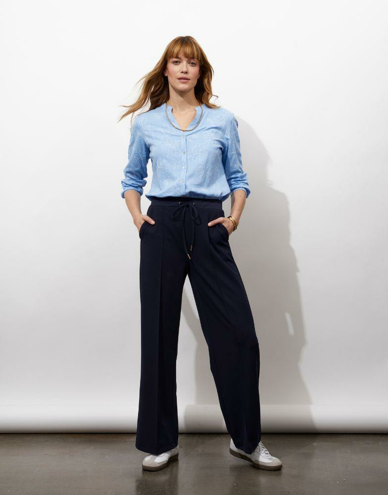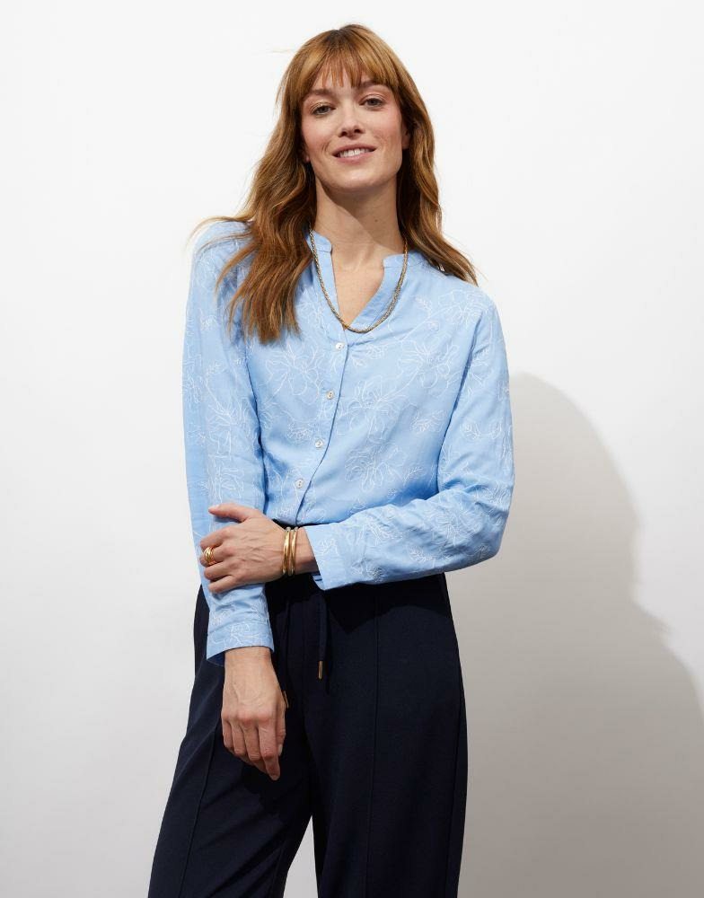 Blouse manches 3/4 unie bleu, coupe fluide, tissu léger avec motif brodé discret. La mannequin mesure 1m75 et porte une taille 38.