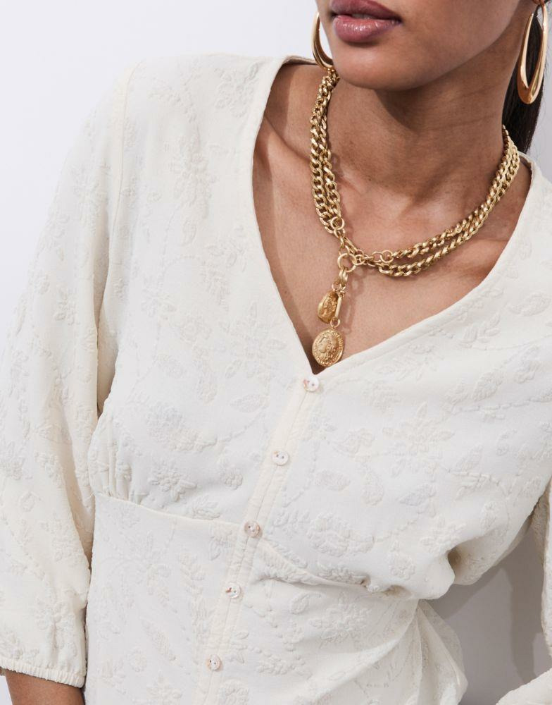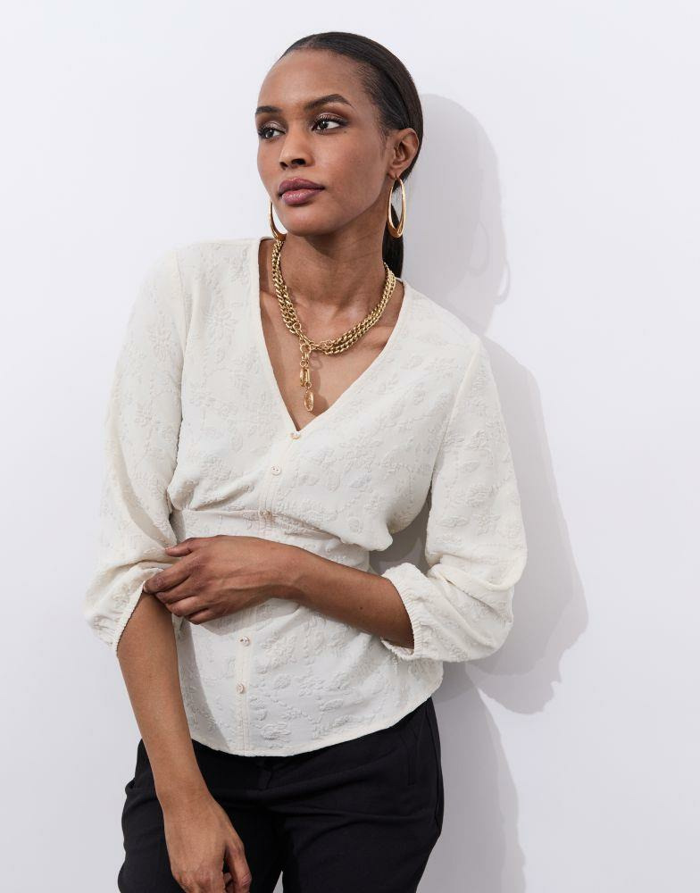 Sublimez votre allure avec cette blouse fluide ECRU, un essentiel féminin et raffiné. Son jeu de relief subtil et son col en V apportent une élégance naturelle à chaque tenue.