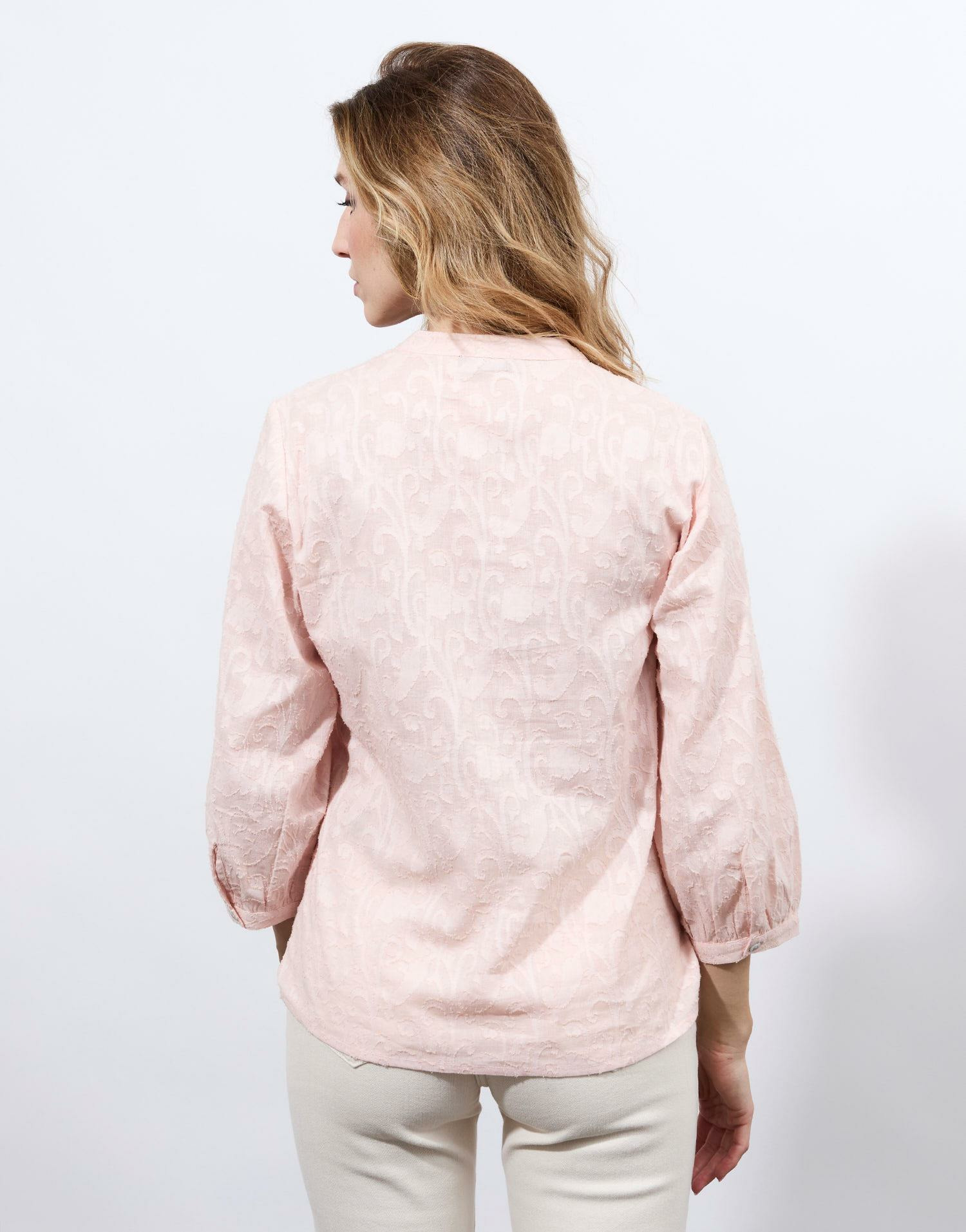 100% coton jacquard, perles brodées. Encolure légèrement ouverte. Manches trois-quarts. Coupe féminine et ajustée. Coloris rose uni.