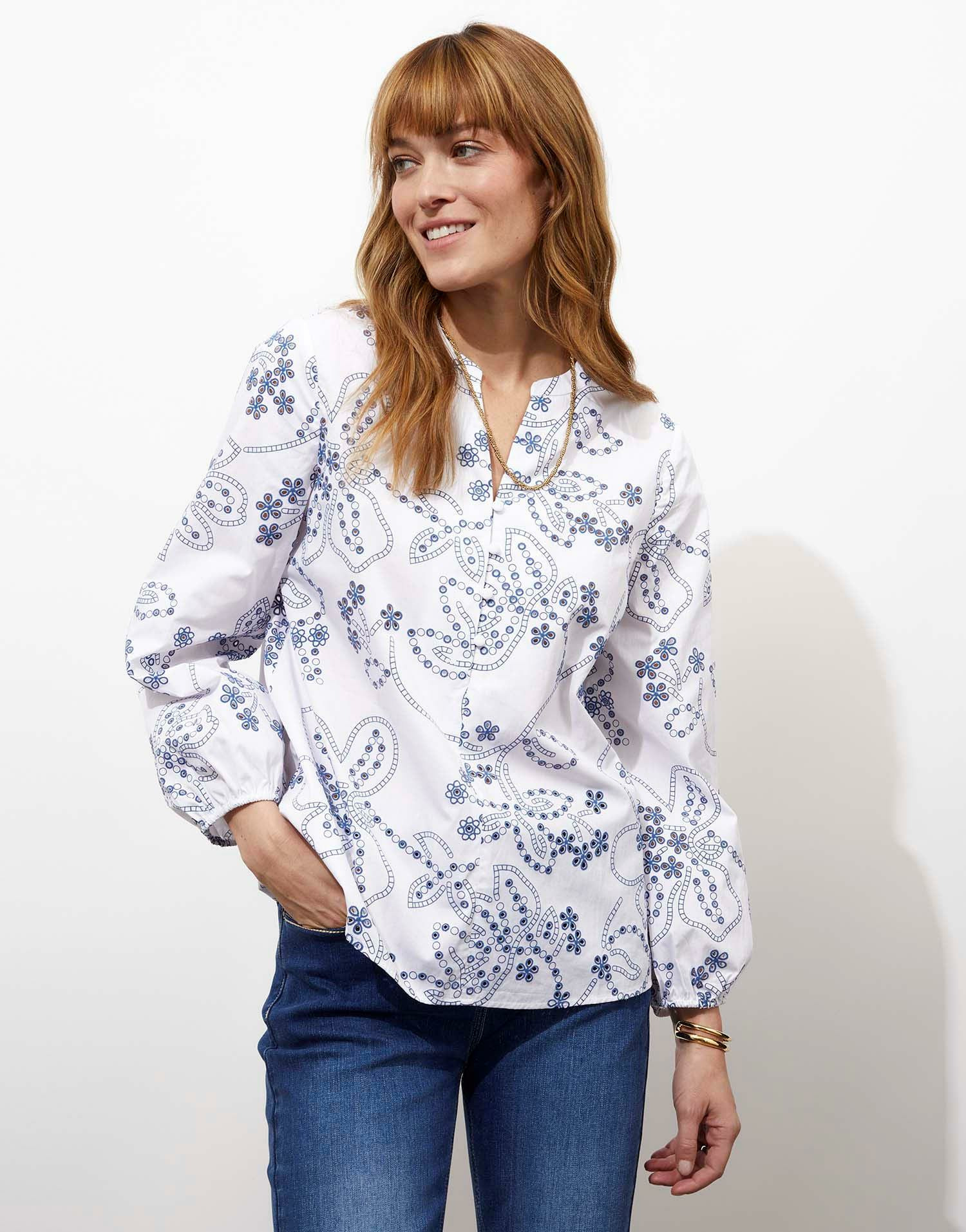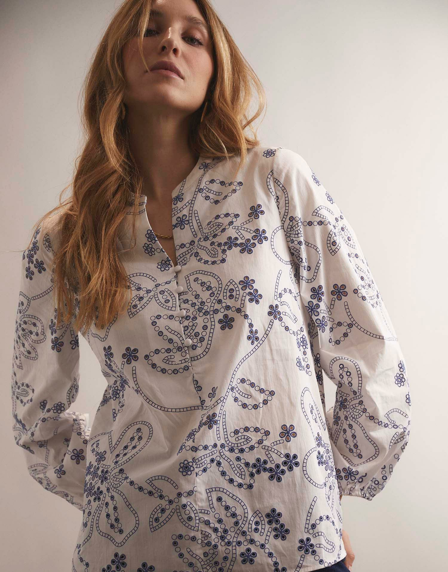 Blouse manches longues en tissu léger à imprimé floral graphique. Coupe fluide avec manches légèrement froncées. La mannequin mesure 1m75 et porte une taille 38.