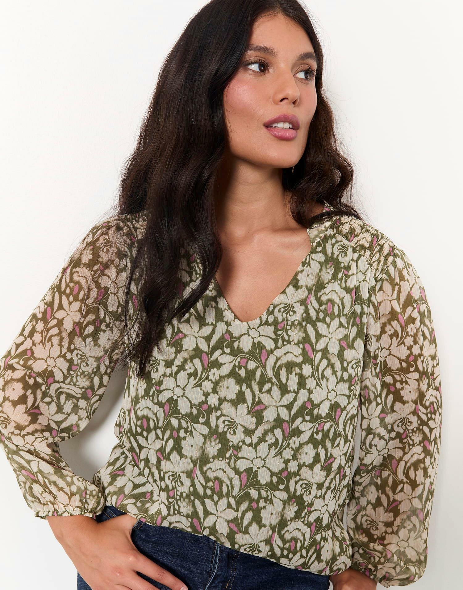 Blouse manches longues à imprimé floral kaki, décolleté en V, coupe fluide. Louna mesure 1m73 et porte une taille 38. Disponible en plusieurs tailles pour un ajustement optimal.
