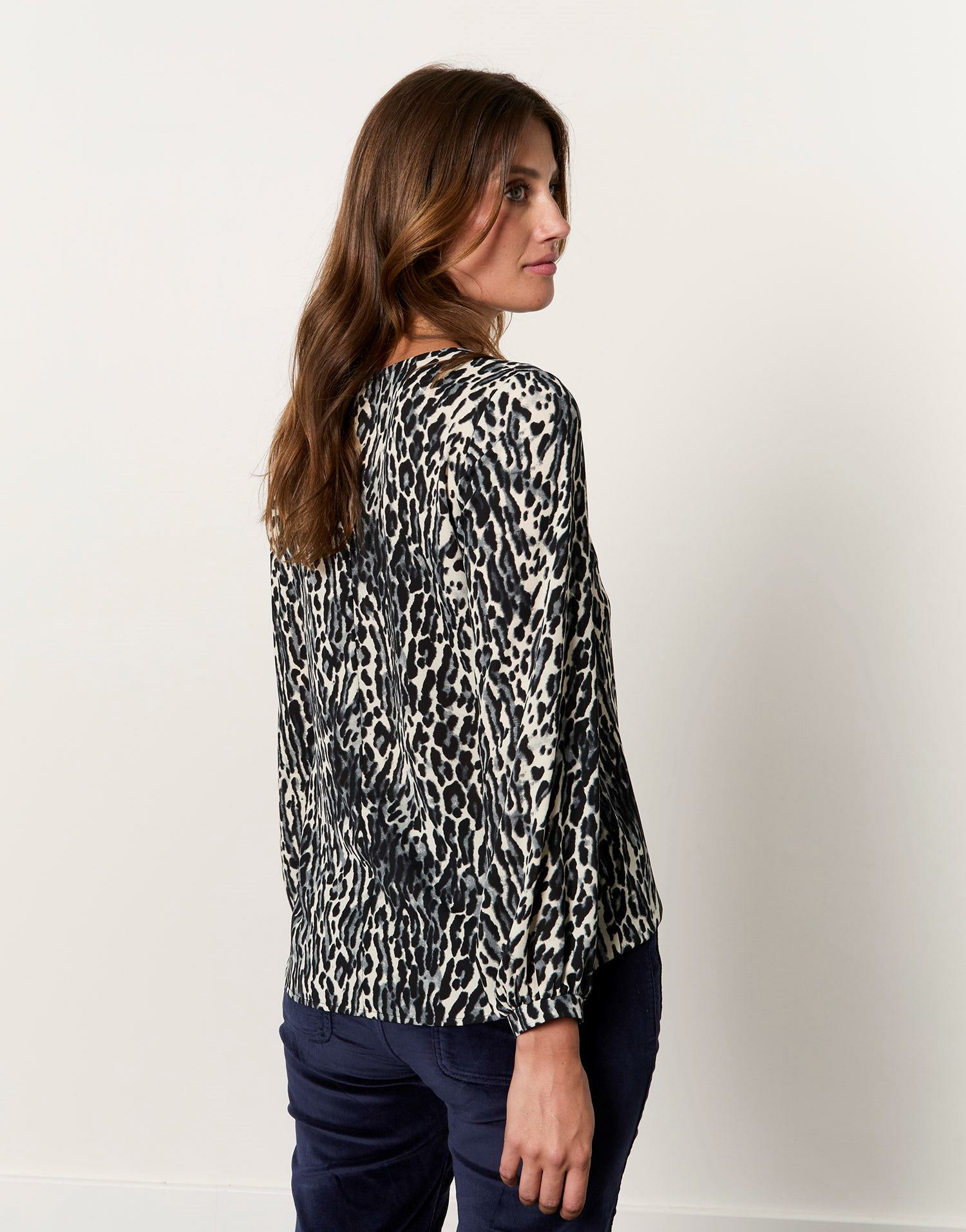 Armelle mesure 1m79 et porte une taille 38. La blouse présente un col V, des manches longues et trois boutons dorés sur le devant. Son imprimé léopard gris offre un style unique et versatile.