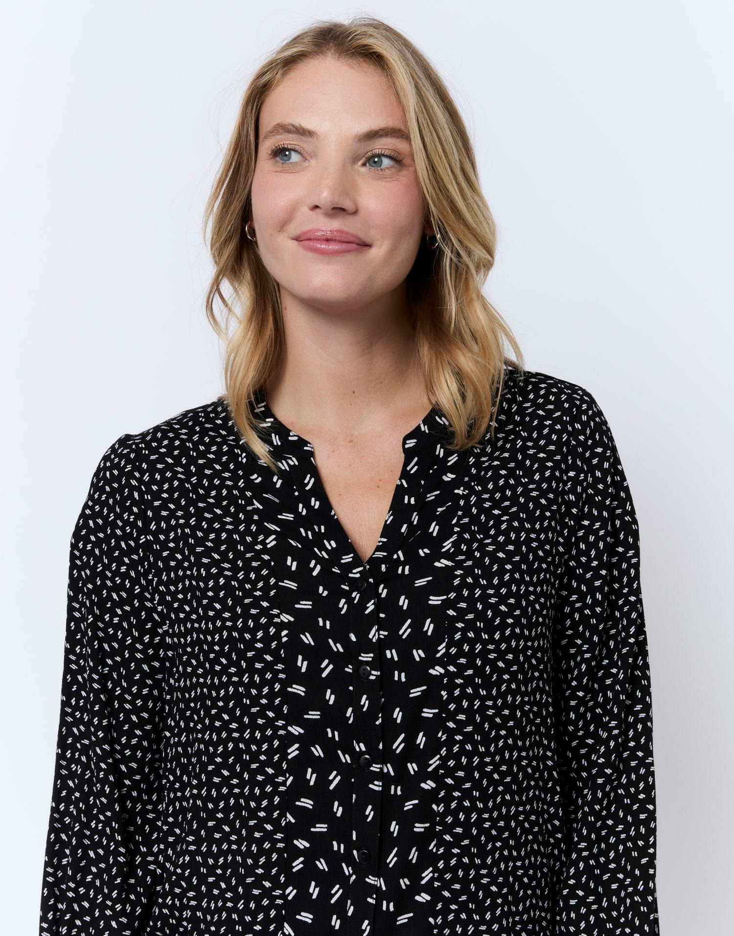 Blouse boutonnée à manches longues, encolure arrondie, coupe fluide. La mannequin mesure 1m75 et porte une taille 38. Disponible en plusieurs tailles pour un ajustement parfait.