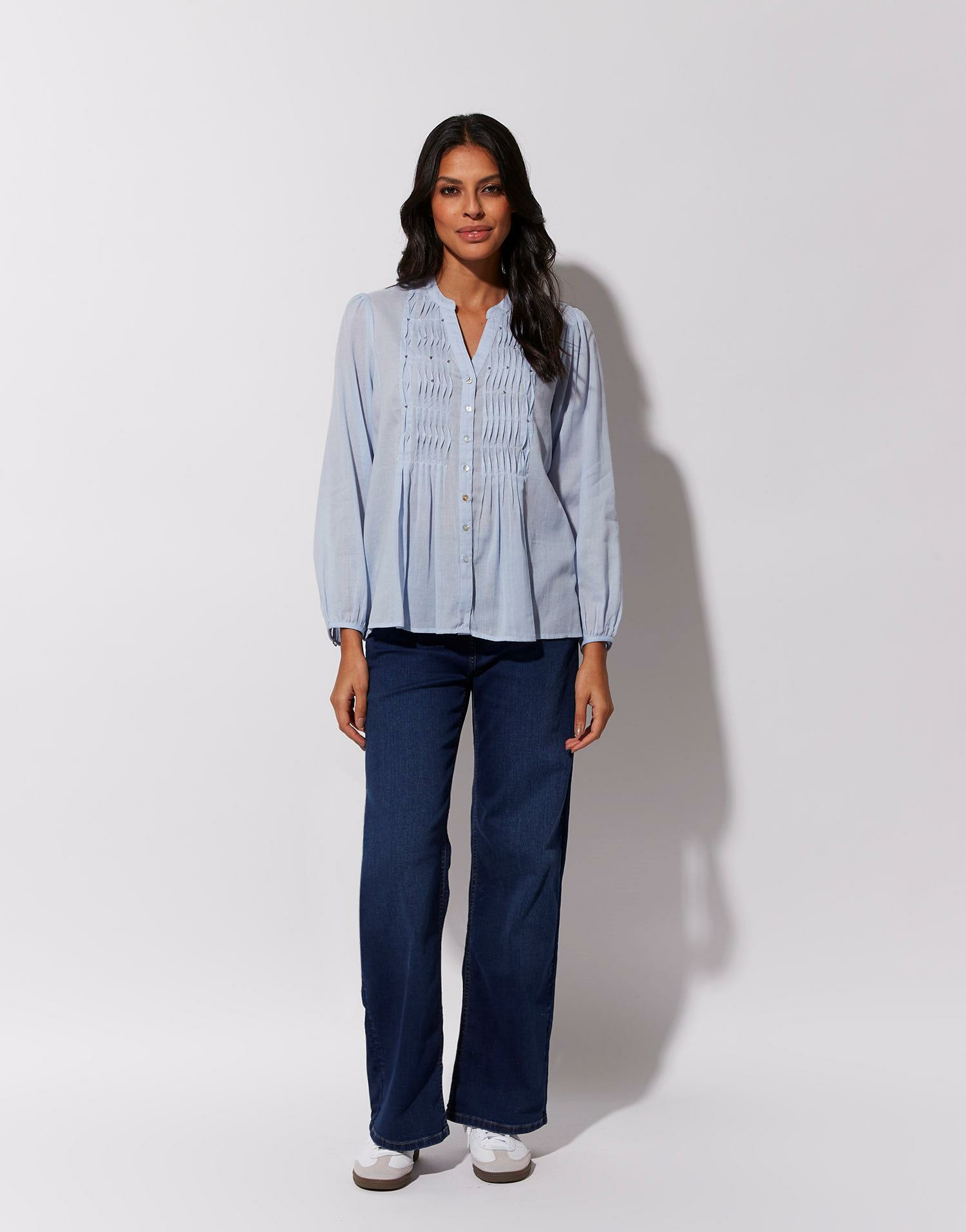 Conçue pour allier confort et style, cette blouse en coton léger épouse délicatement la silhouette grâce à son décolleté en V et ses manches longues fluides. Sa couleur bleu ciel lumineuse s’adapte aussi bien à un look professionnel qu’à une tenue décontractée, offrant une polyvalence rare. Bianca, mannequin de 1m75, porte une taille 38, illustrant parfaitement la coupe ajustée et flatteuse de ce modèle.