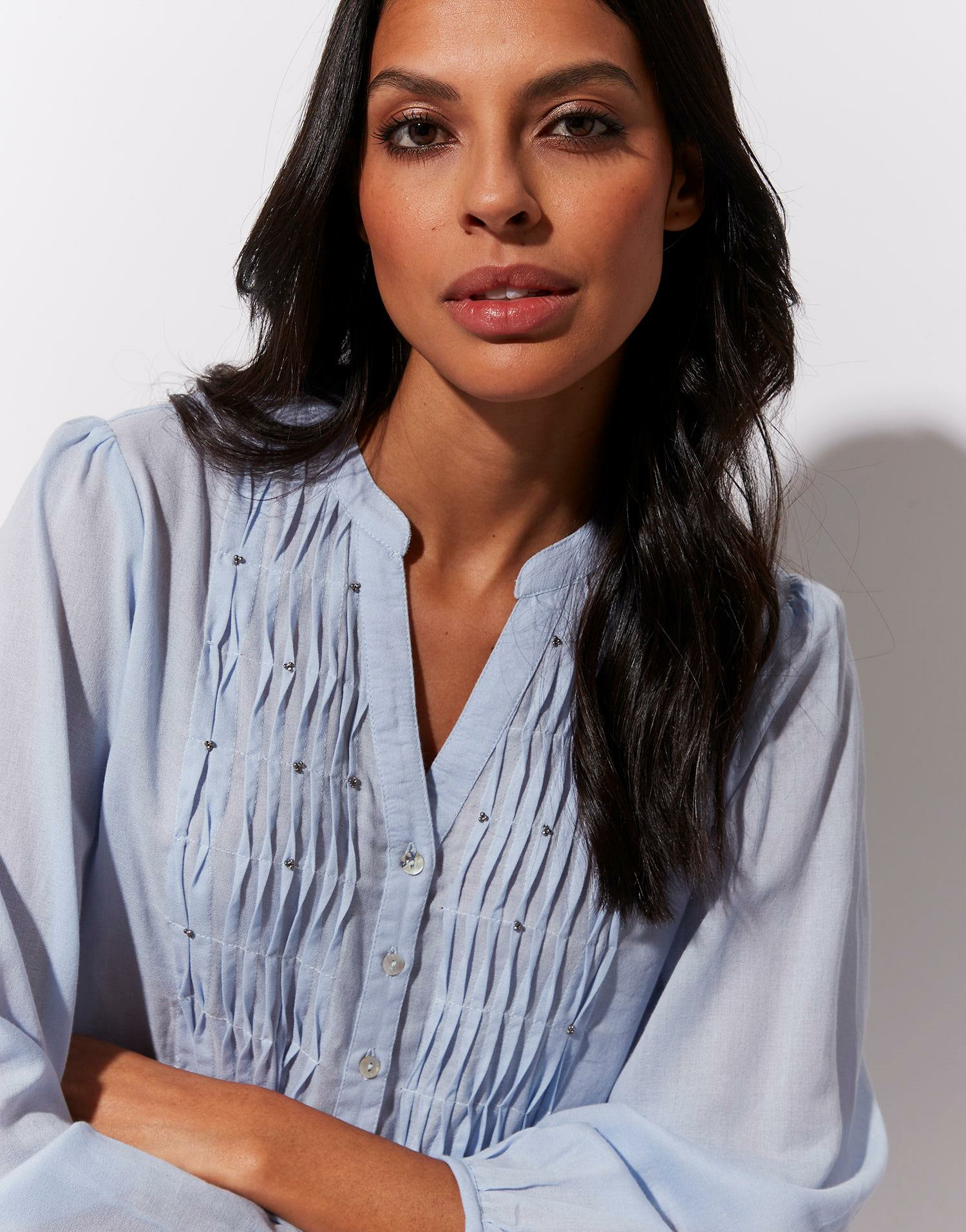 Sublimez votre allure avec cette blouse manches longues bleu ciel, un essentiel chic et intemporel signé RIU Paris. Sa silhouette épurée et ses perles brodées apportent une touche d’élégance discrète, idéale pour toutes vos tenues.