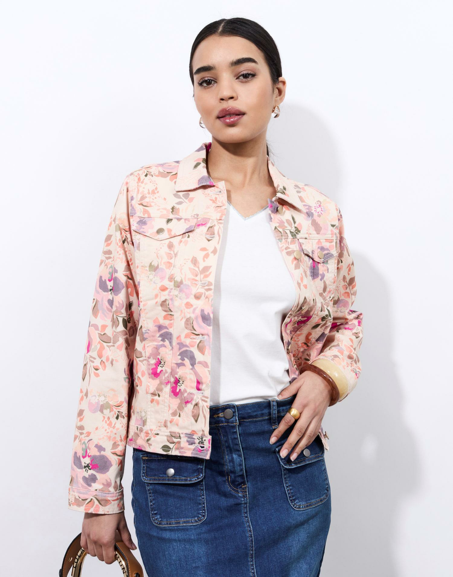 Blouson en taille 38 porté par un mannequin de 1m75. Fermeture boutonnée, col classique, poches poitrine à rabat. Imprimé floral sur tissu léger, idéal pour un usage quotidien.