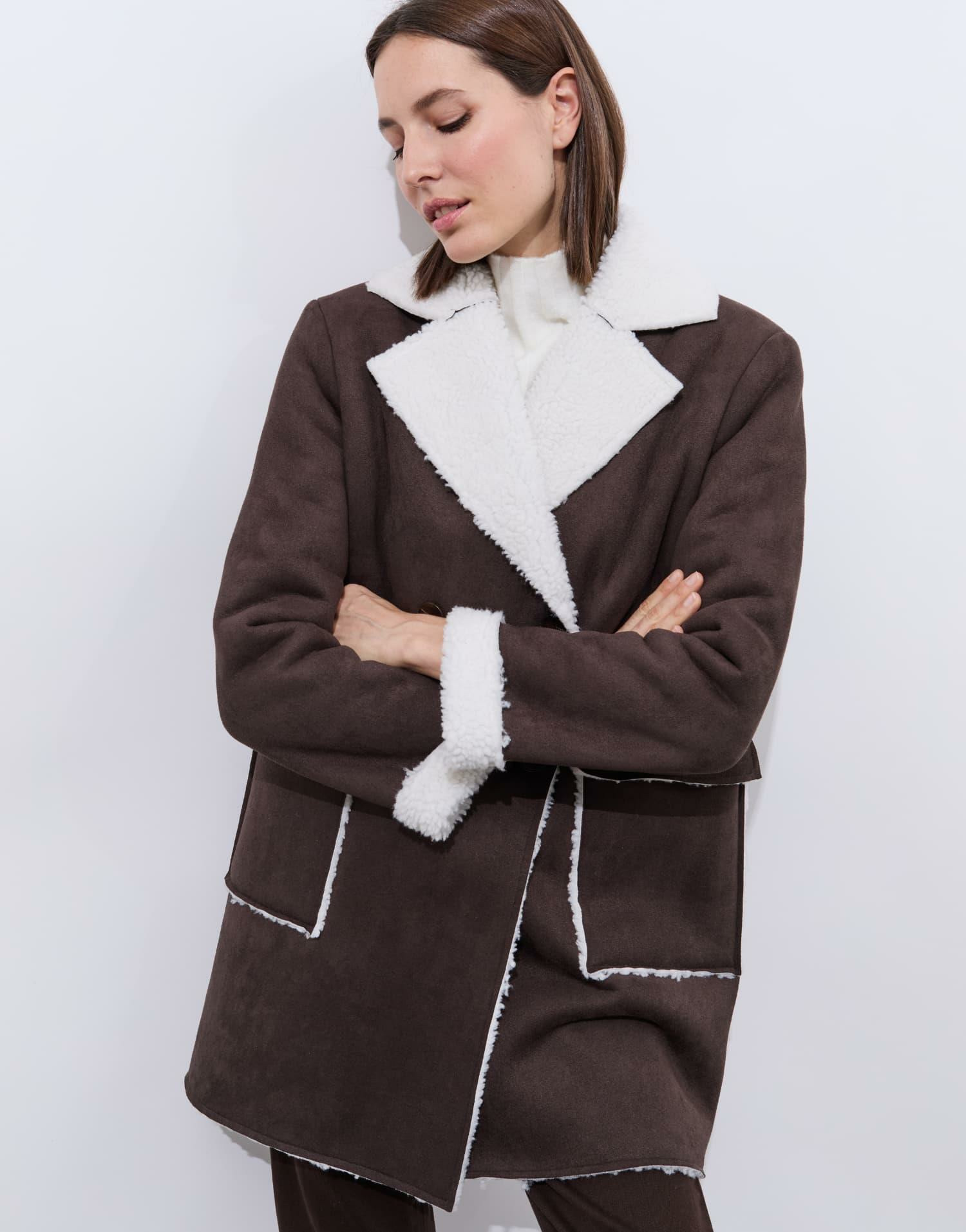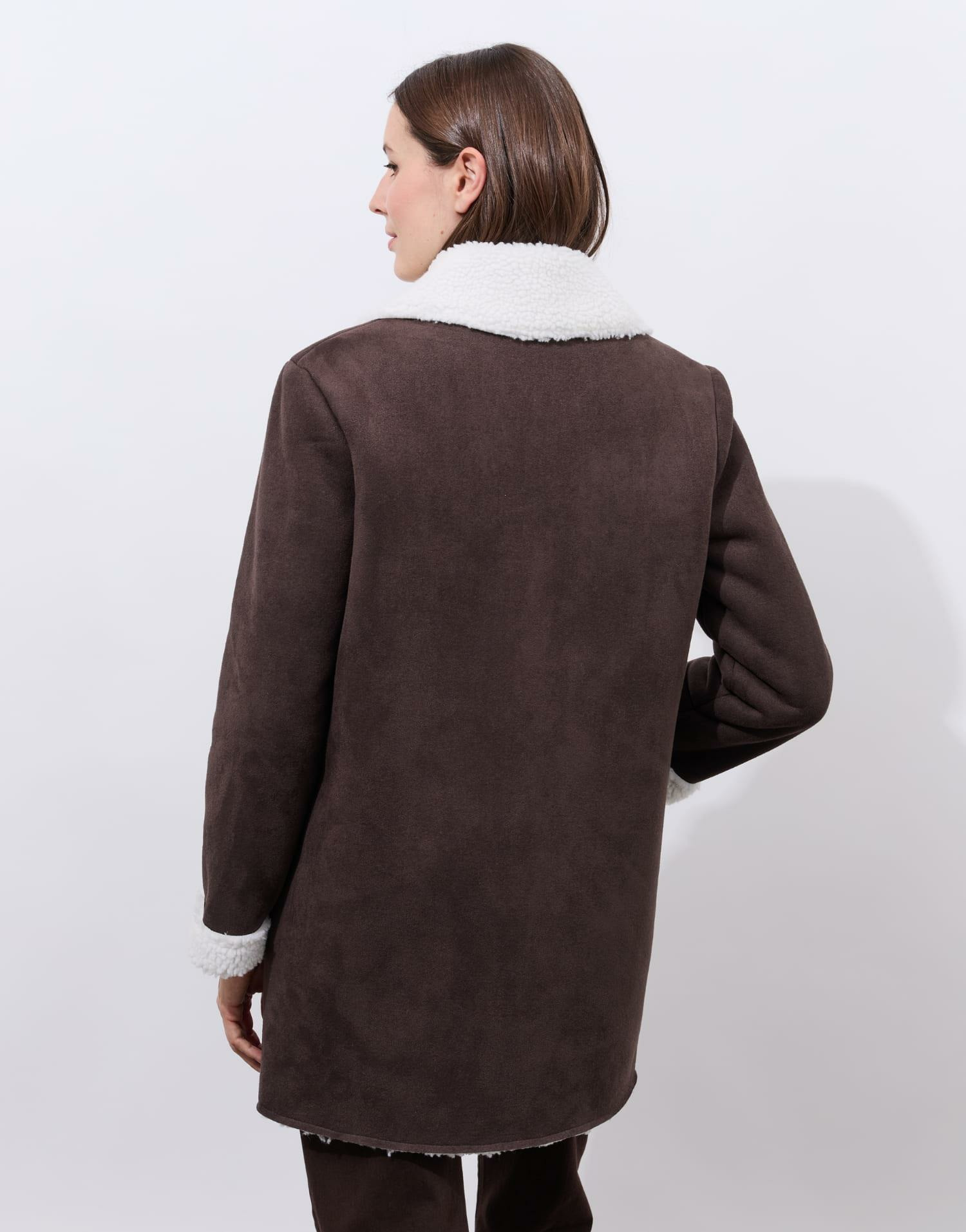 Confectionné dans une matière douce et chaude, ce caban se distingue par son col tailleur qui affine la silhouette et ses manches longues qui protègent du froid. La fausse fourrure effet peau lainée sur le col ajoute une note sophistiquée et chaleureuse, parfaite pour affronter la saison froide avec style. Son coloris marron profond s’accorde facilement à toutes vos pièces, du jean casual à la robe habillée.