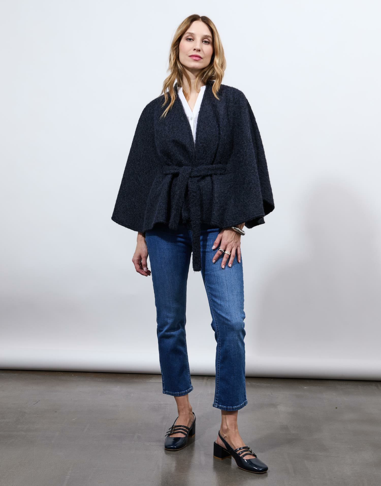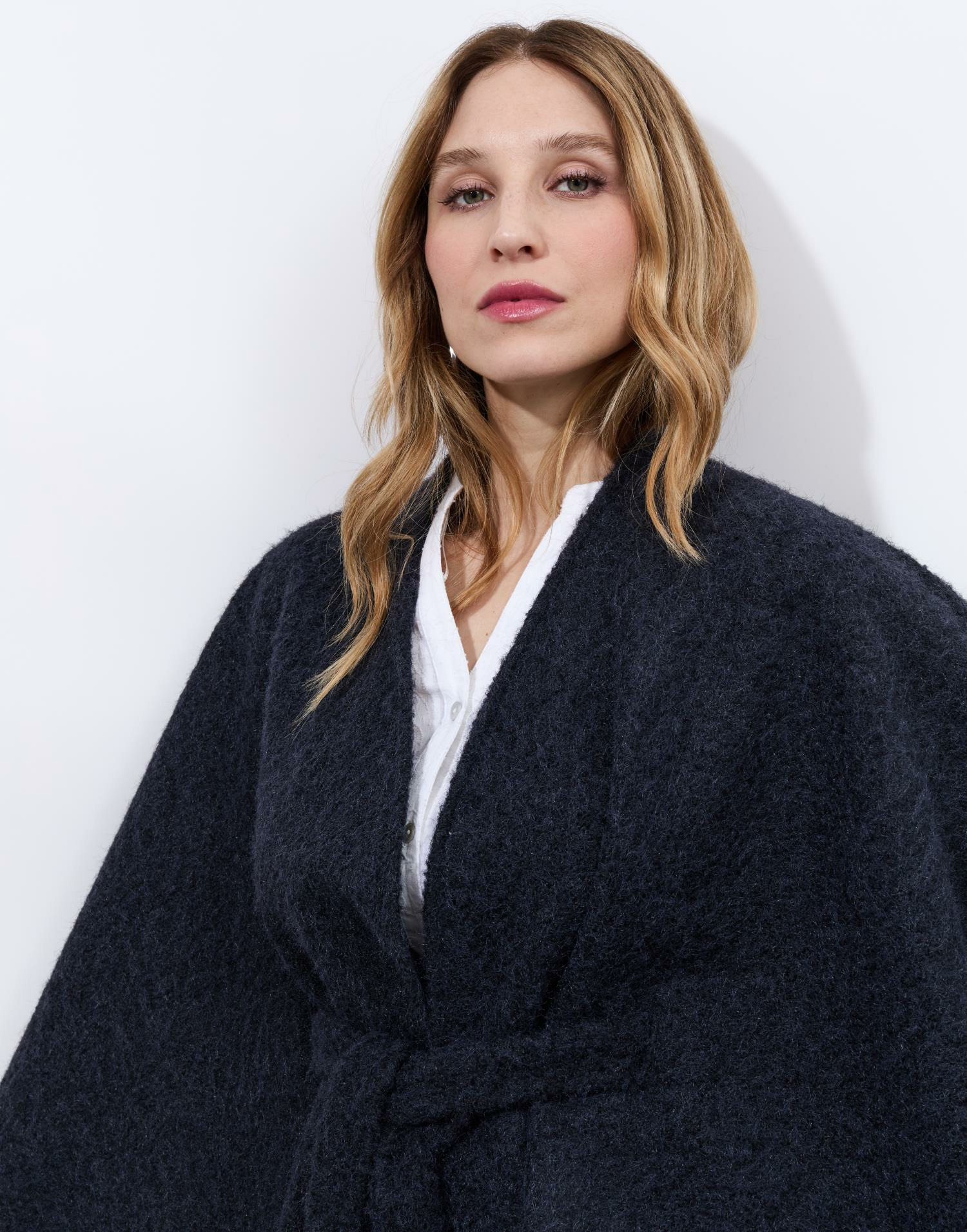 Cette cape est réalisée en tissu aspect lainage, 100% polyester, garantissant résistance et entretien facile. Sa longueur midi et son col simple renforcent son design épuré, tandis que sa teinte marine s’adapte à toutes les garde-robes.