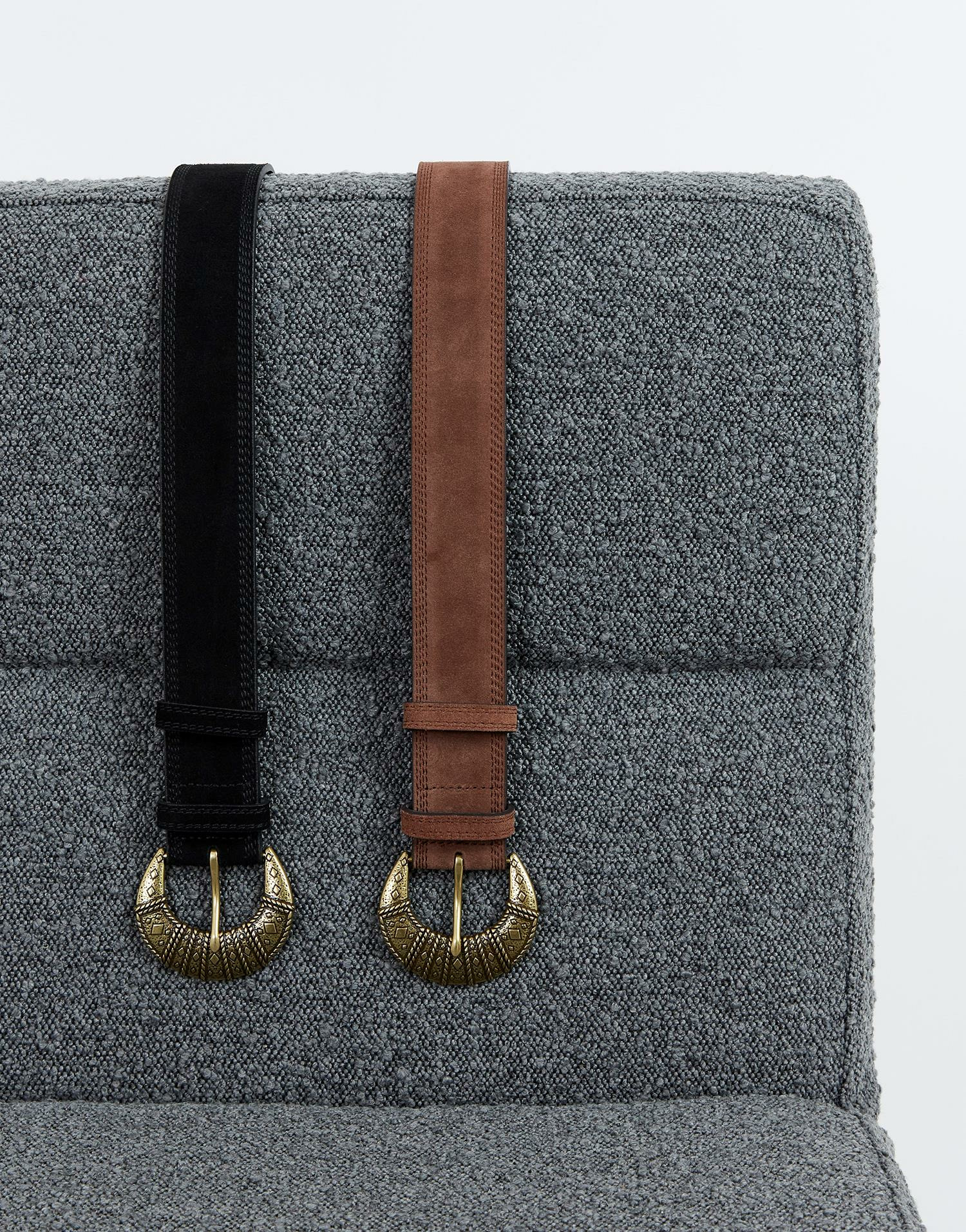 Fabriquée à 100% en cuir de vachette, cette ceinture mesure entre 3 et 5 cm de largeur selon le modèle choisi. Sa finition suédine offre un toucher doux et une apparence raffinée. La boucle, pensée pour se démarquer, complète ce design minimaliste et moderne.