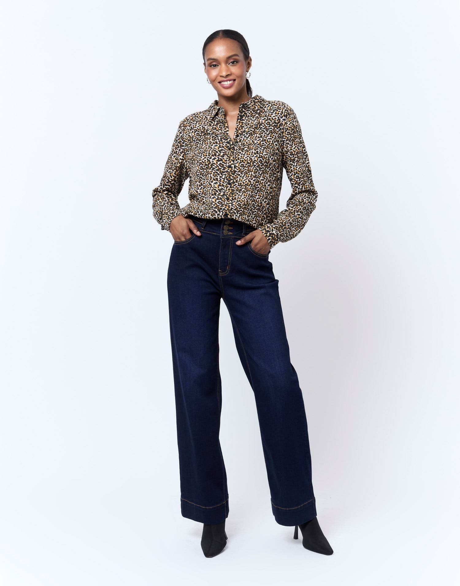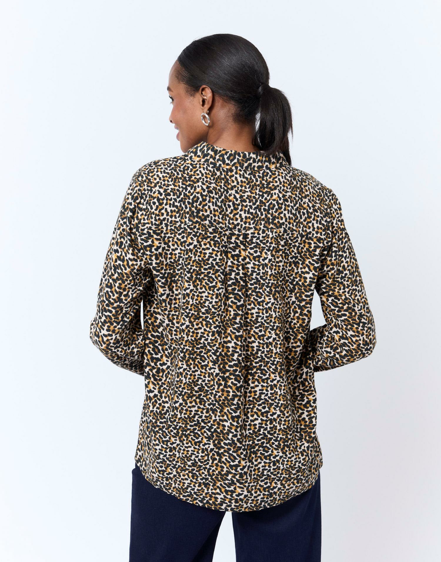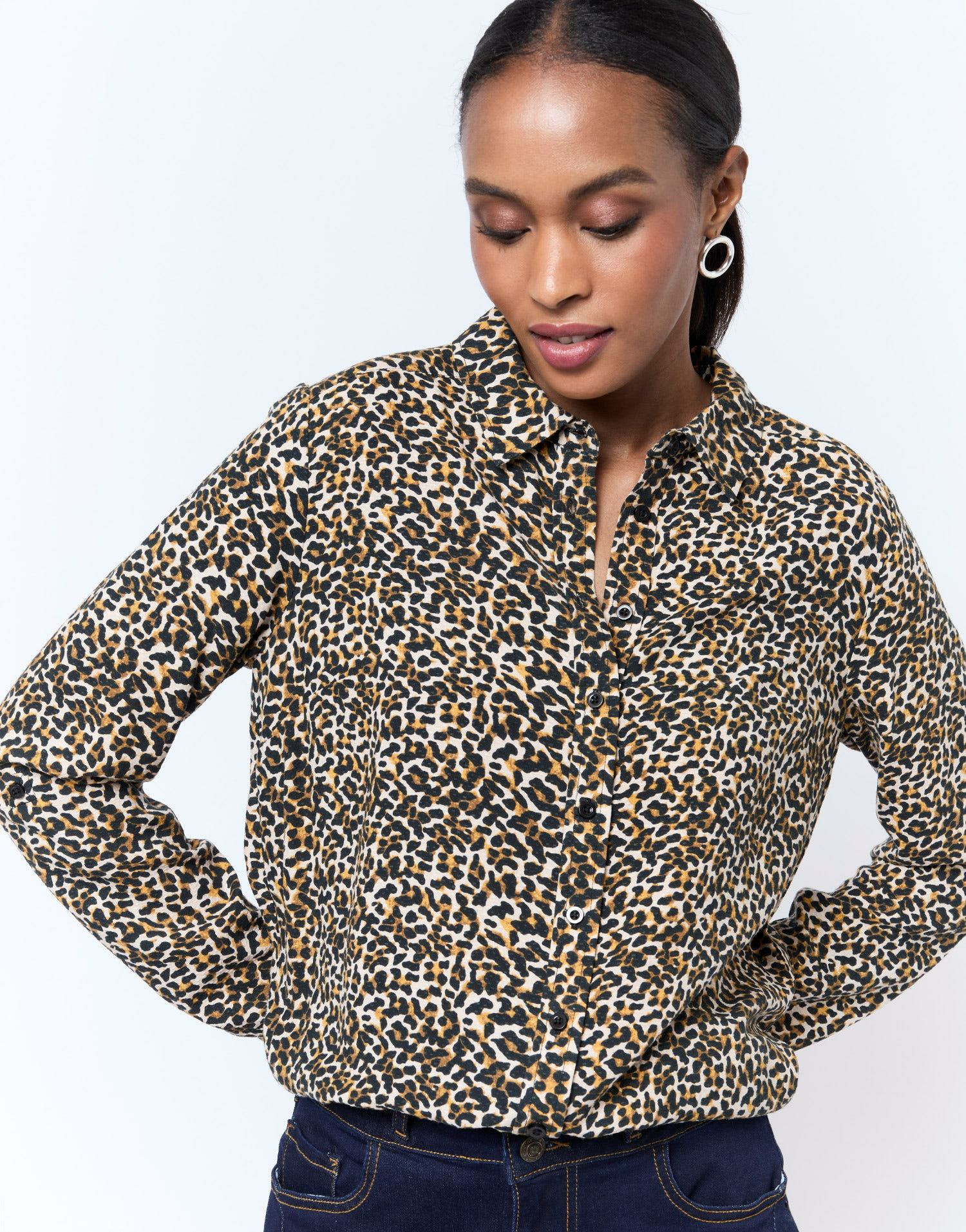 Confectionné dans un tissu fluide, ce chemisier se distingue par son imprimé léopard subtil aux nuances marron, parfait pour dynamiser vos tenues quotidiennes. Le col chemisier structuré et les manches longues apportent une touche classique qui équilibre parfaitement l’audace du motif, idéal pour passer du bureau à une sortie en soirée sans effort.