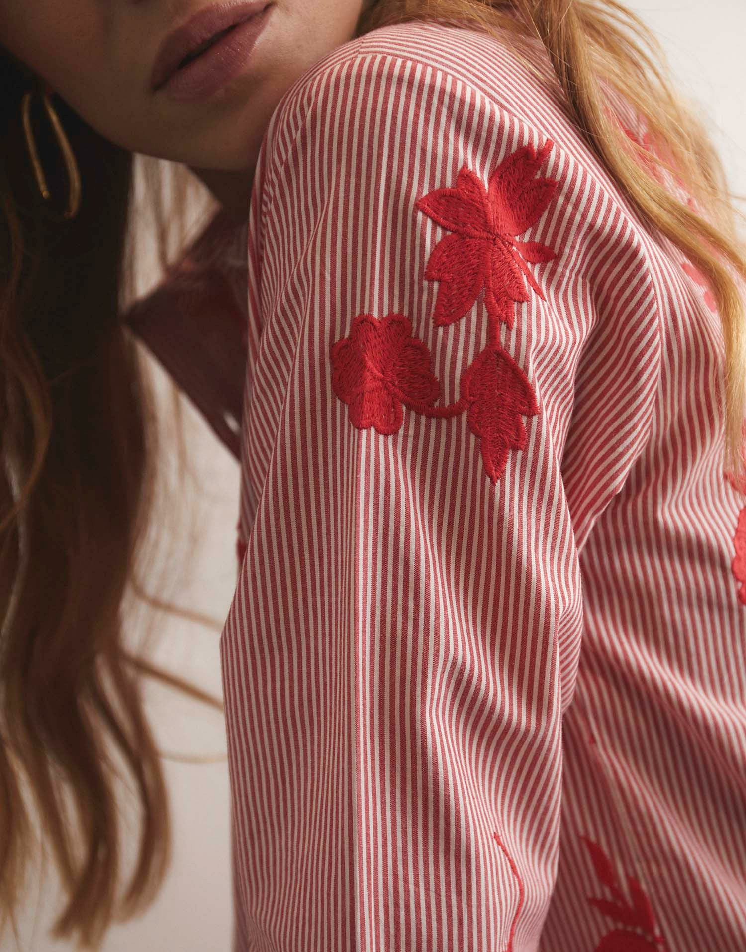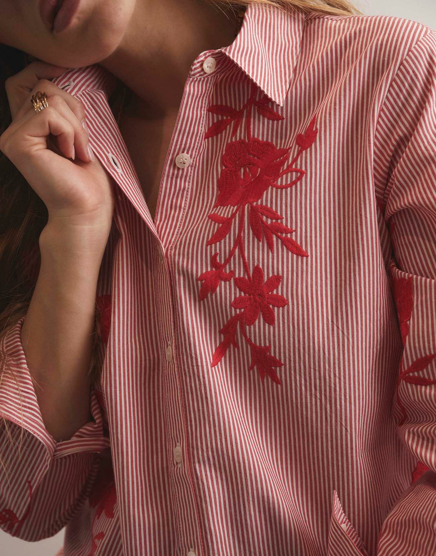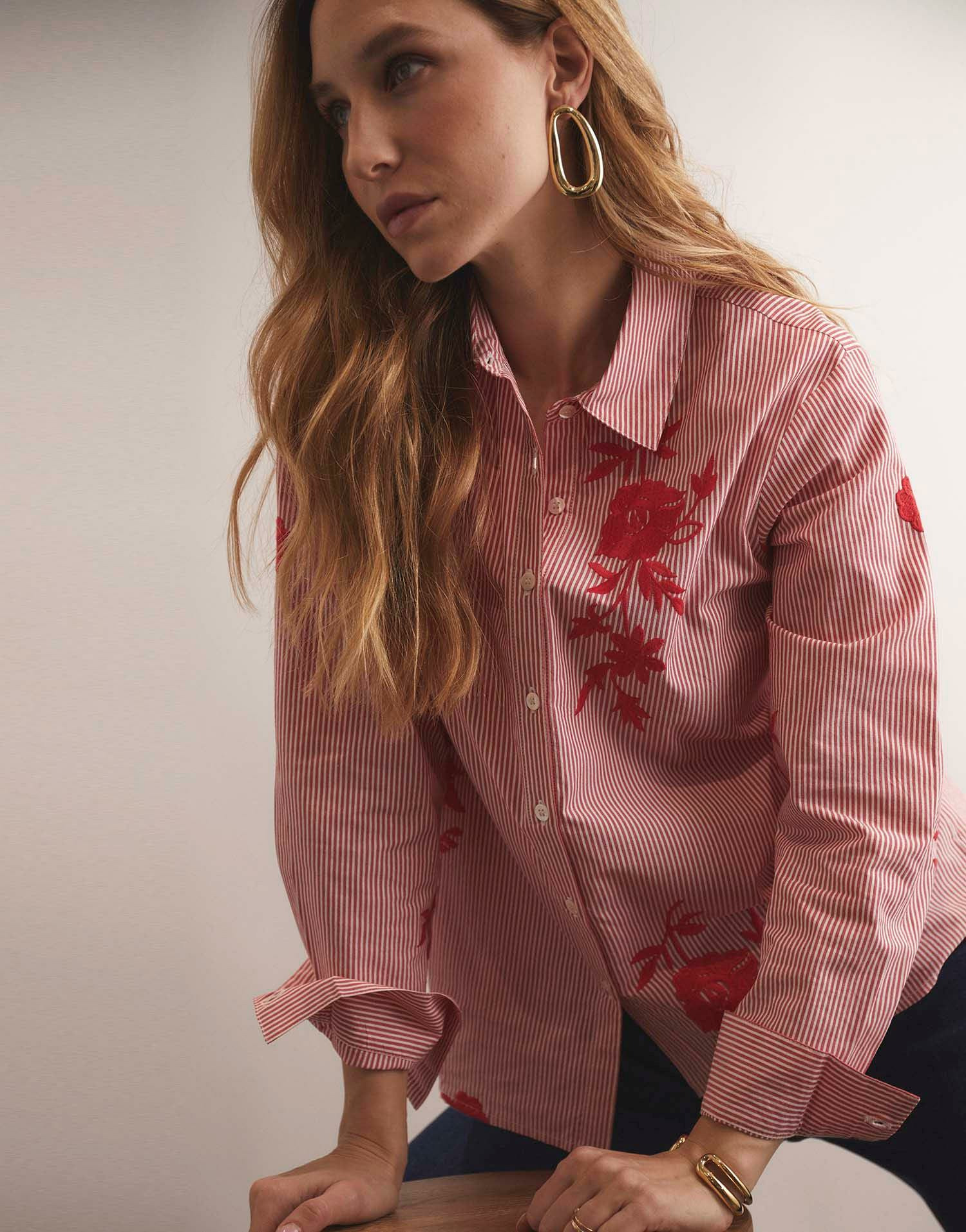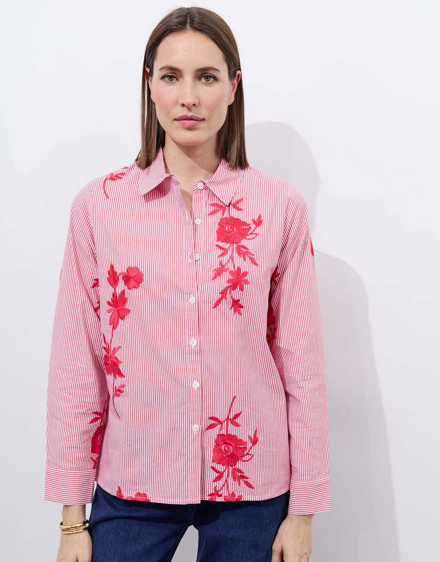 Conçu pour une coupe droite facile à porter, ce chemisier se distingue par son motif multicolore rayé rehaussé de broderies florales délicates qui apportent profondeur et raffinement. Polyvalent, il s’adapte à toutes vos envies : rentré dans un jean pour un look soigné ou porté fluide pour une allure décontractée chic.