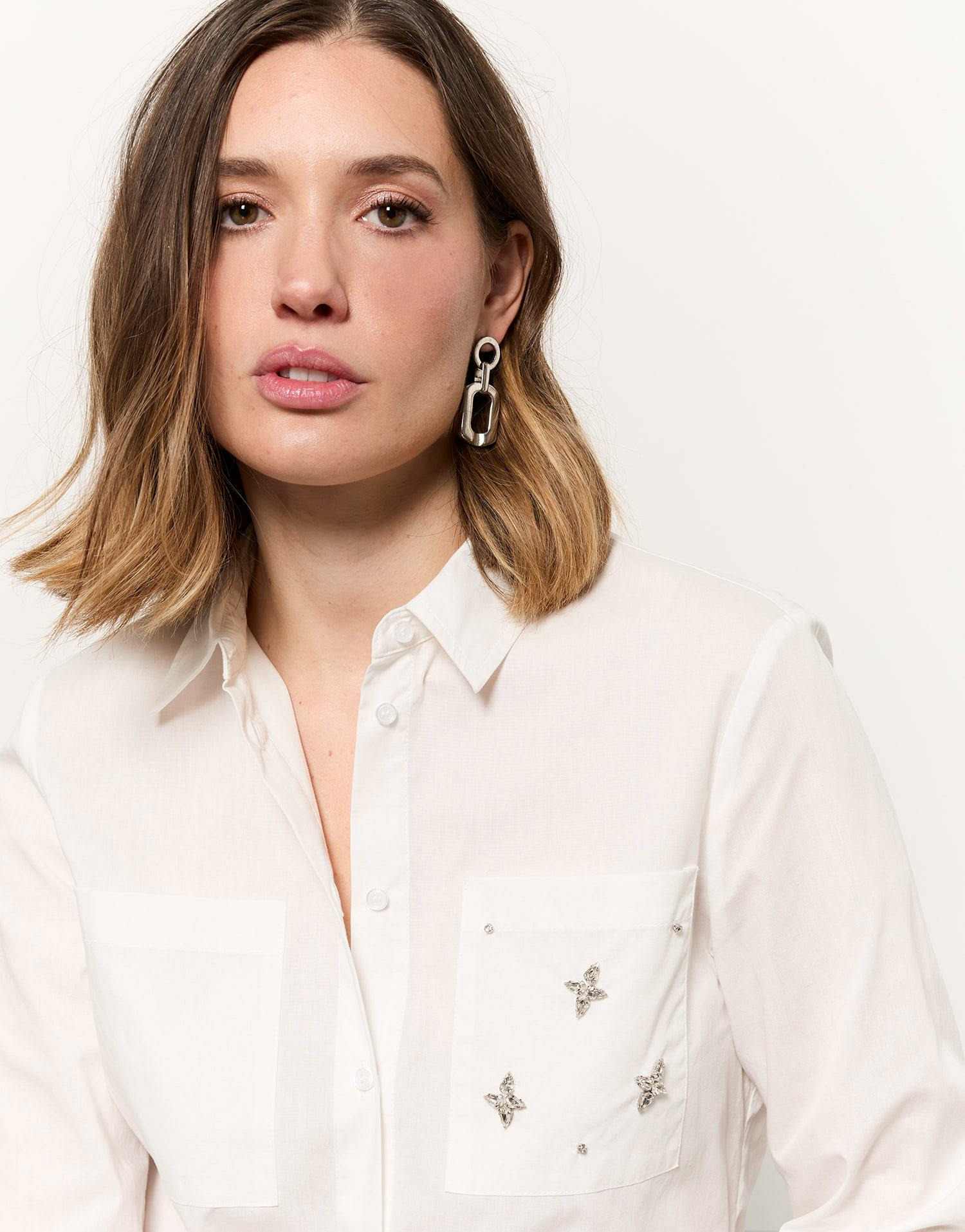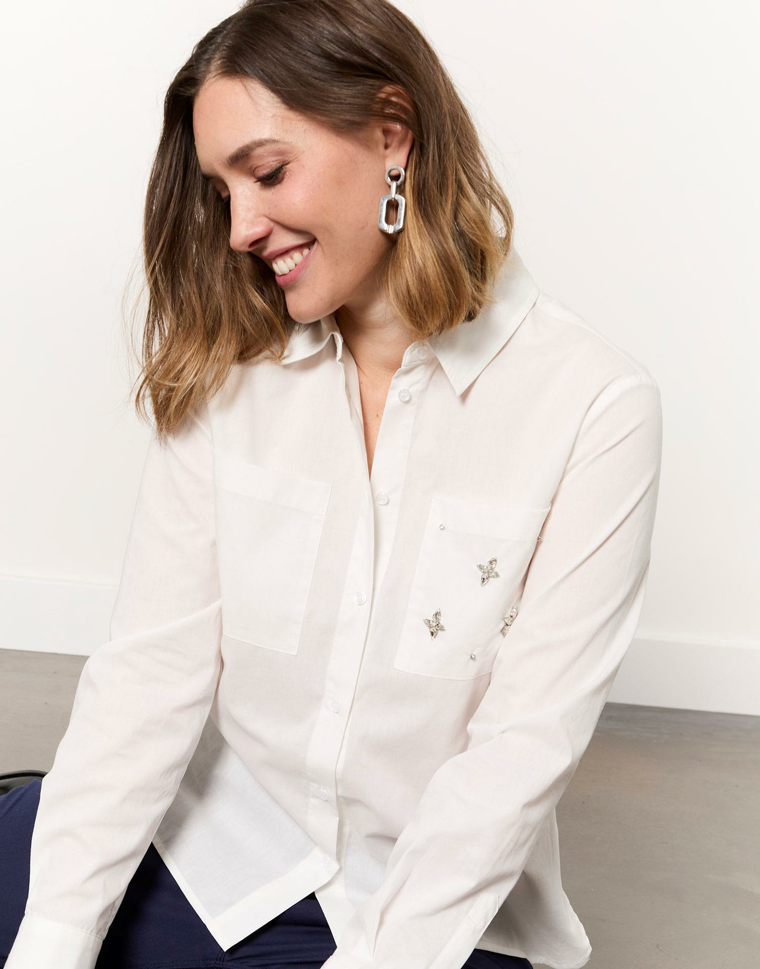 Manches longues, coupe droite intemporelle, coloris blanc uni, détail strass sur la poche poitrine. Disponible en plusieurs tailles. Léo mesure 1m77 et porte une taille 38.