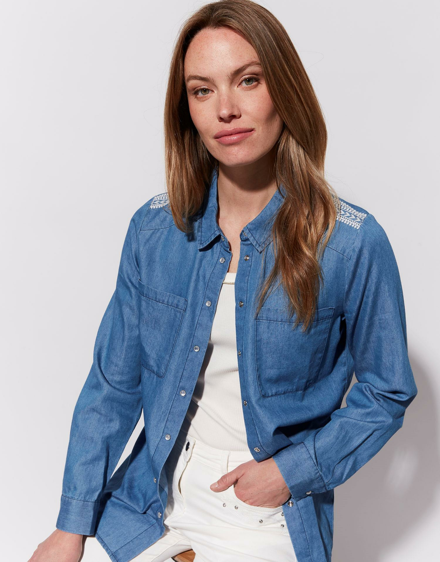 Confectionné en tencel, ce chemisier offre une douceur et une fluidité incomparables. Ses deux grandes poches avant et sa fermeture par boutons-pressions lui confèrent un style pratique et moderne. Portez-le fermé pour un look soigné ou ouvert sur un top pour une allure casual et tendance. La fine broderie sur les épaules ajoute une touche subtile d’originalité qui fait toute la différence.