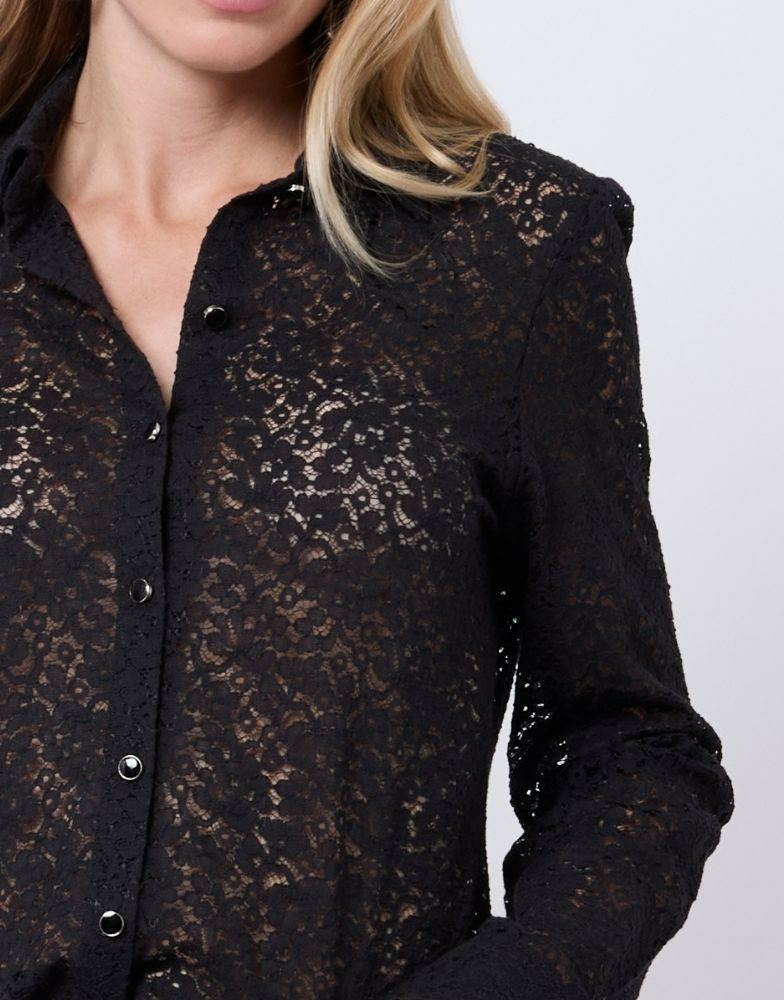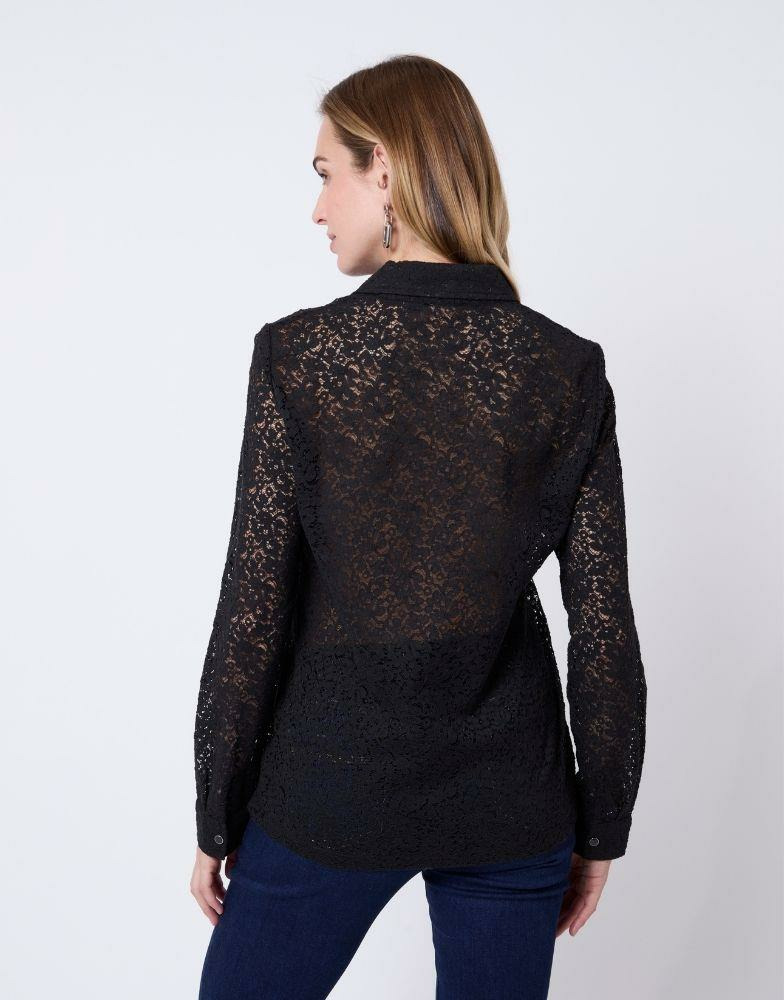 Disponible en taille 38 portée par le modèle, ce chemisier est conçu avec un tissu en dentelle fine, doté de manches longues et d’un col chemisier classique. Sa teinte noire unie garantit une allure sobre et sophistiquée.
