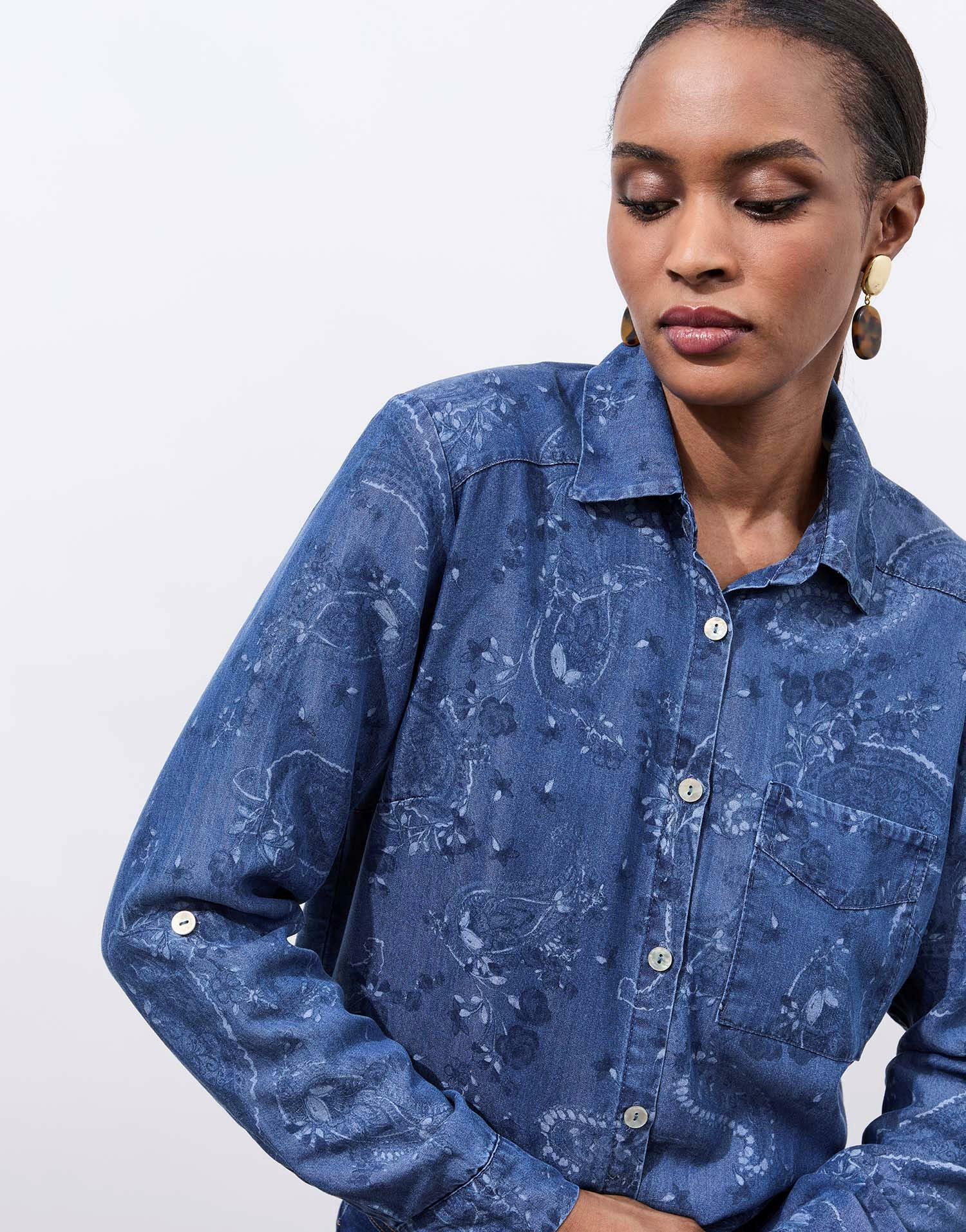 Matière : denim léger à imprimé floral discret. Coupe fluide et féminine. Manches longues. La mannequin mesure 1m75 et porte une taille 38.
