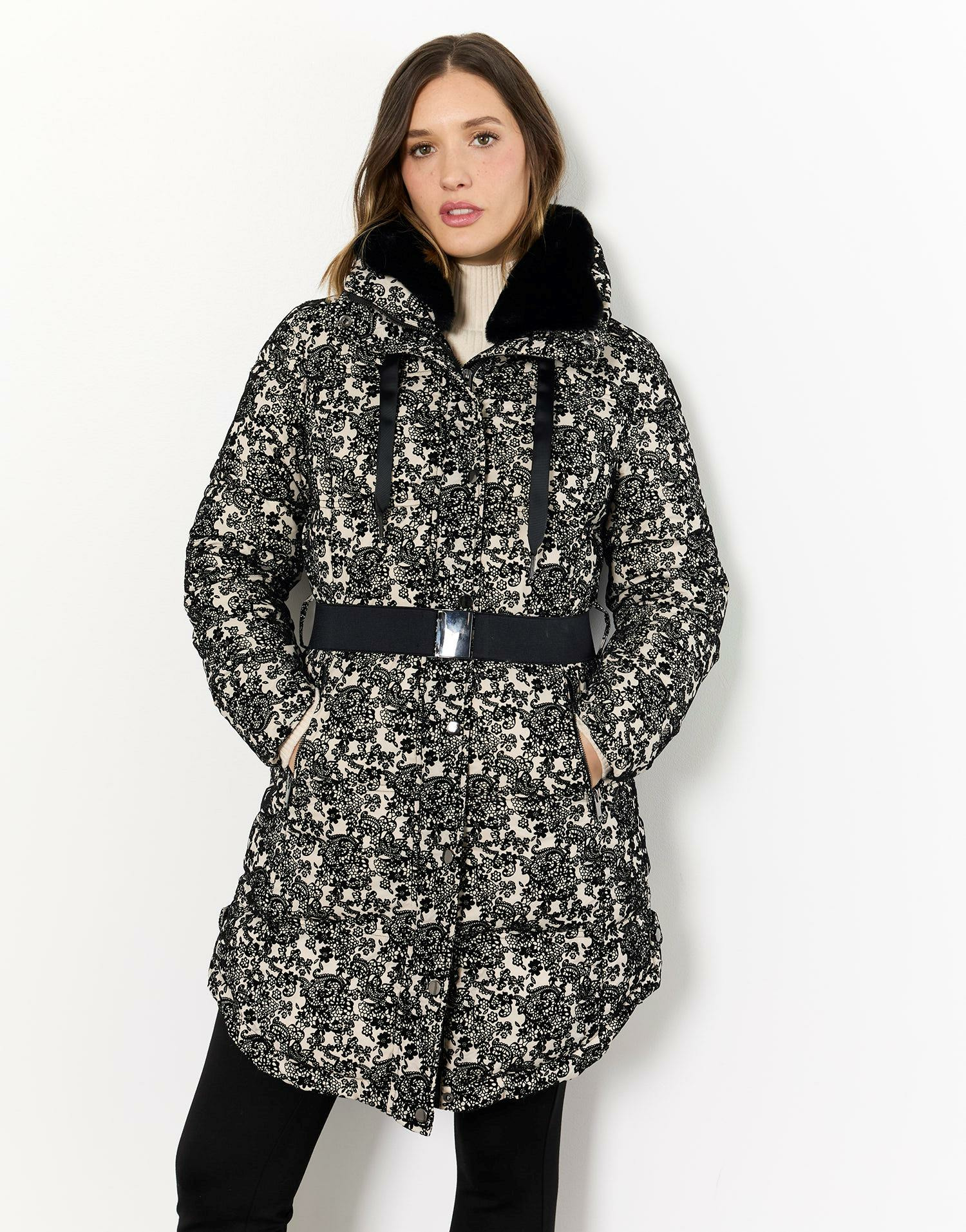 Longueur genoux, motif floral flocké, col en fausse fourrure noire, capuche intégrée et repliable dans le col. Léo mesure 1m77 et porte une taille 38.